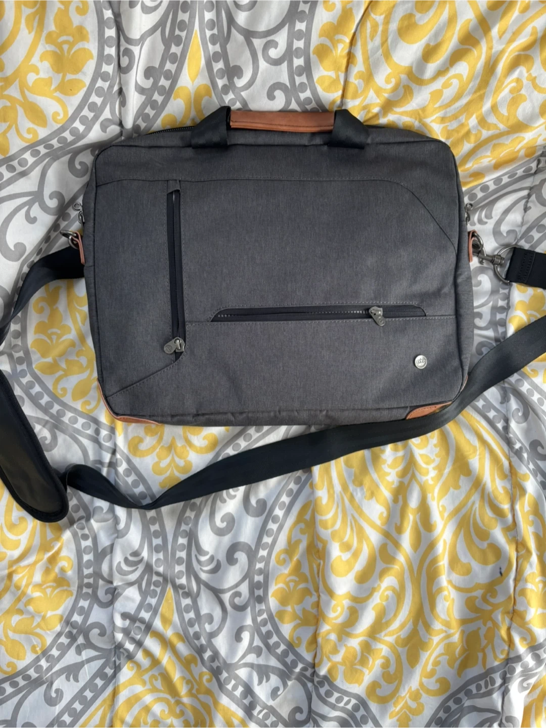 This is a grey PKG brand messenger bag designed for laptops. It's made of durable fabric with a striped interior lining and includes a detachable shoulder strap. Multiple zippered compartments are available for organization.