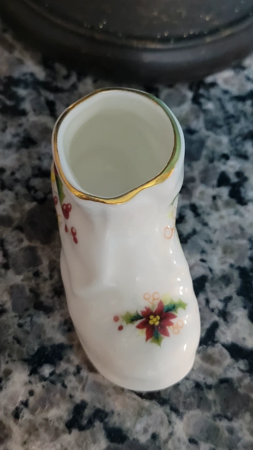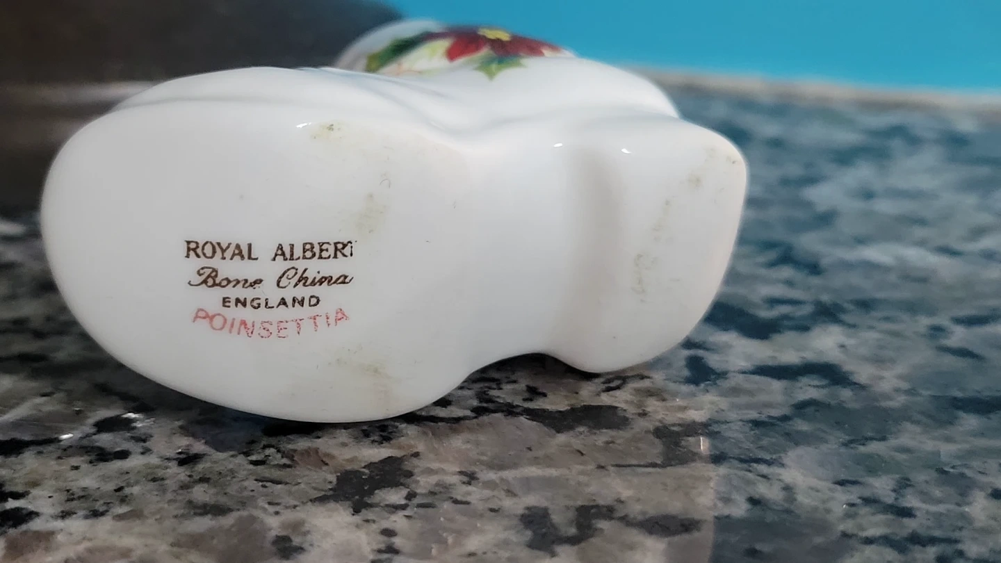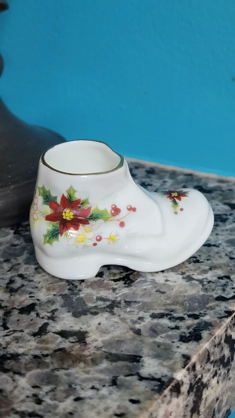 A lovely Royal Albert bone china trinket dish in the shape of a boot. It's decorated with a festive poinsettia design and has a gold trim. Perfect for holding small items or as a charming seasonal decoration!