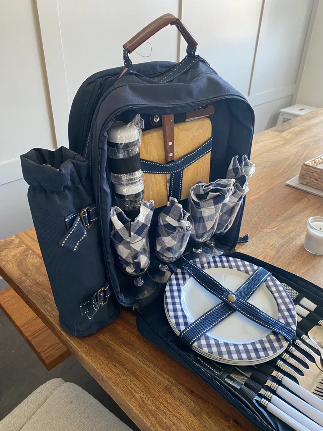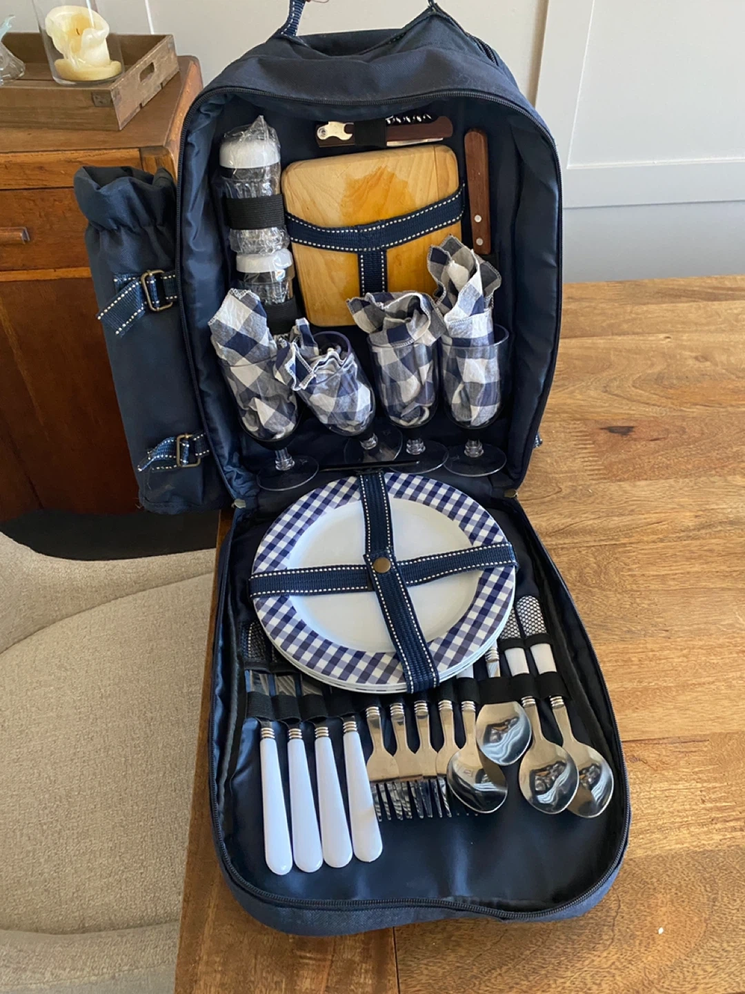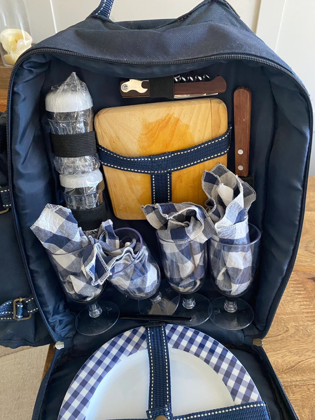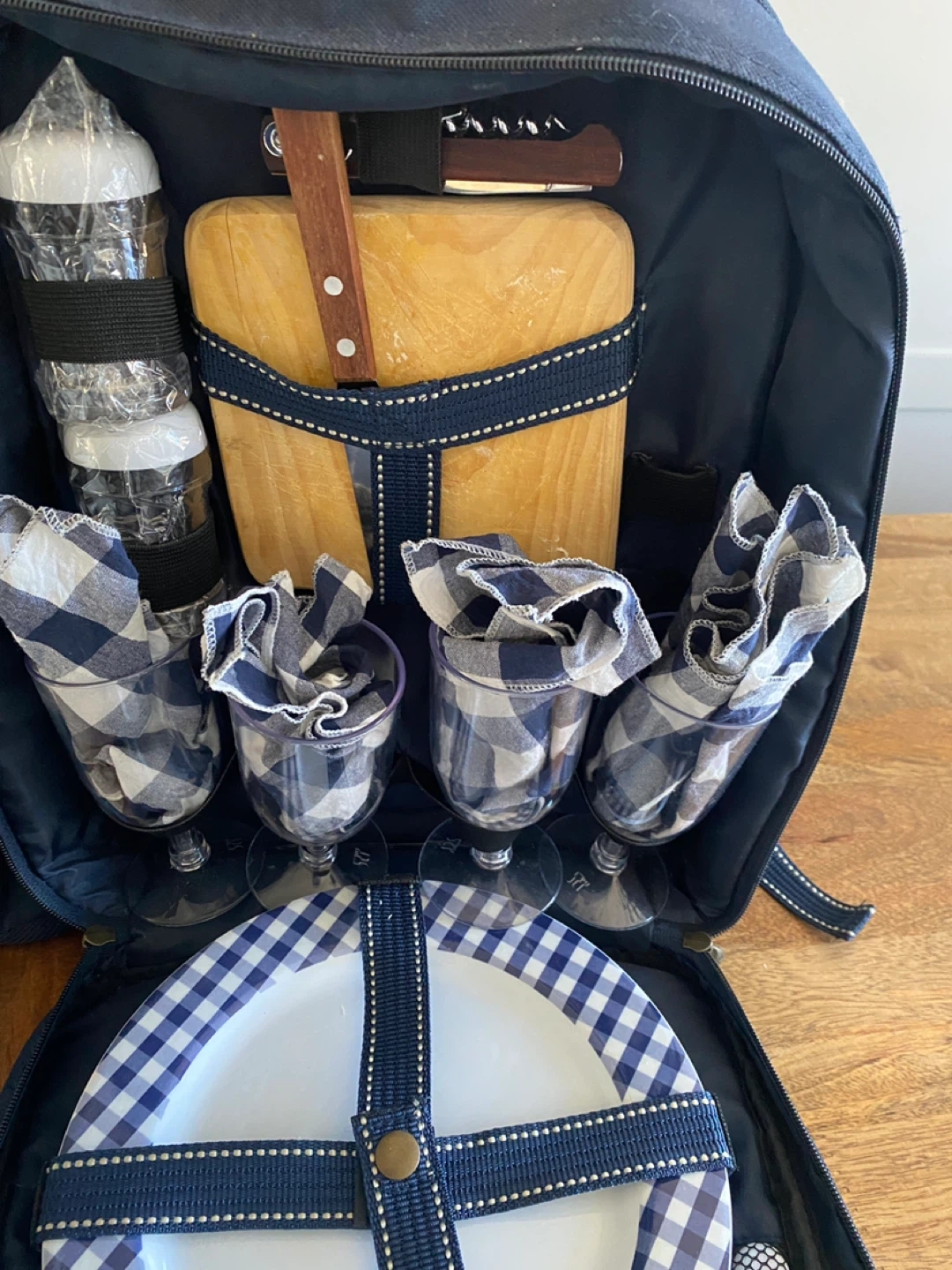 The set includes a lightweight, fully insulated backpack with a detachable insulated bottle bag, and a picnic blanket. Inside are a cutting board, cheese knife, bottle opener, salt and pepper shakers, and a four-place setting of plastic wine glasses, melamine plates, stainless-steel cutlery and cloth napkins.