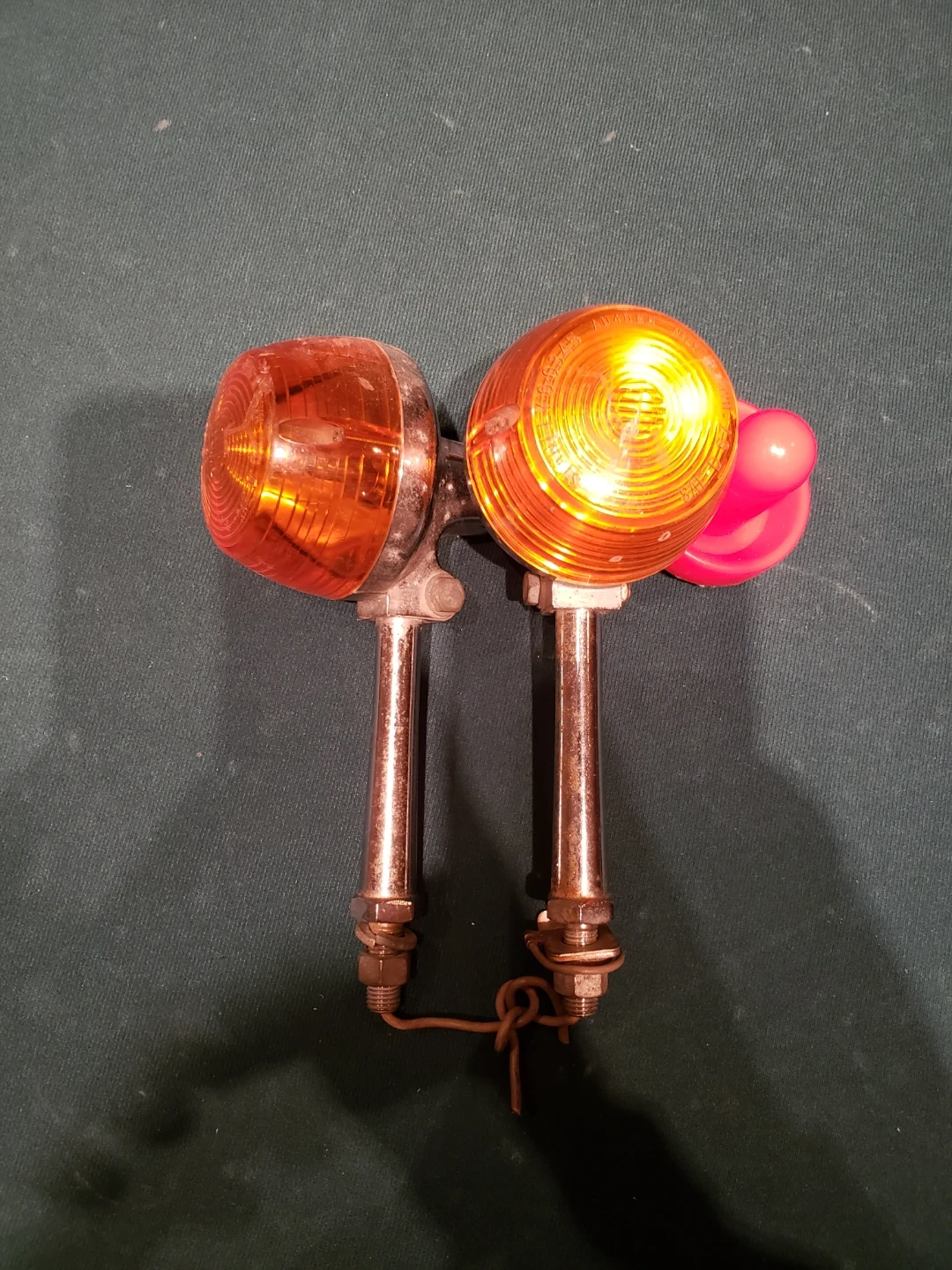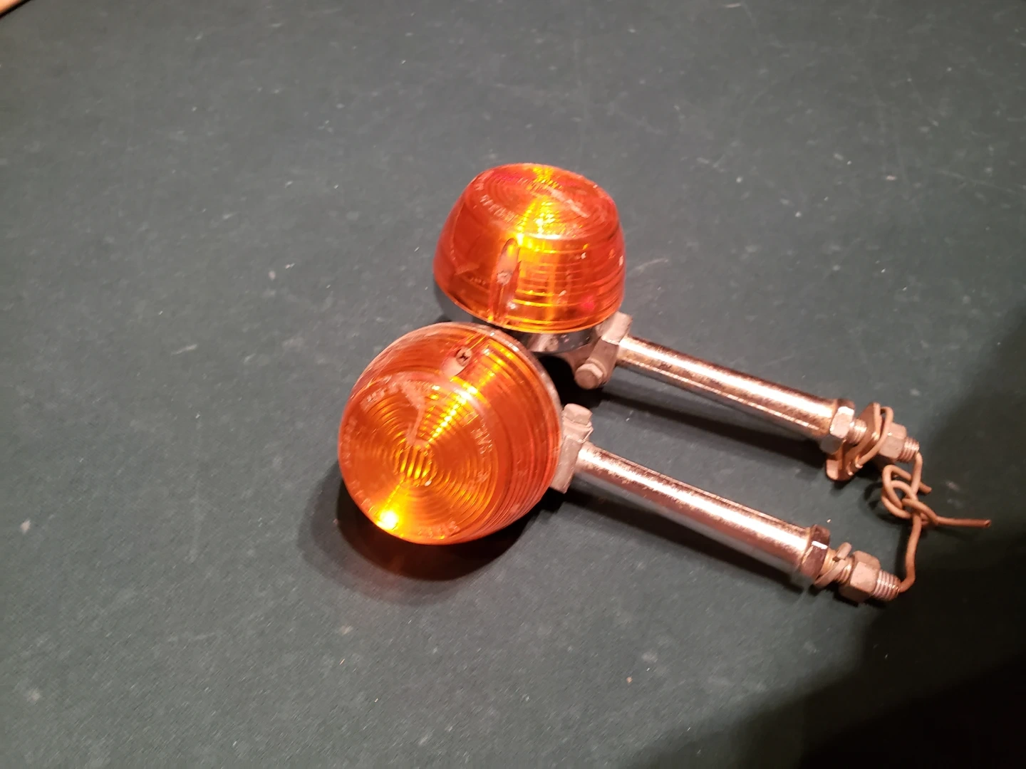 This is a pair of vintage amber motorcycle turn signals. They have a chrome stem and an orange plastic lens. They're a classic look for older bikes!