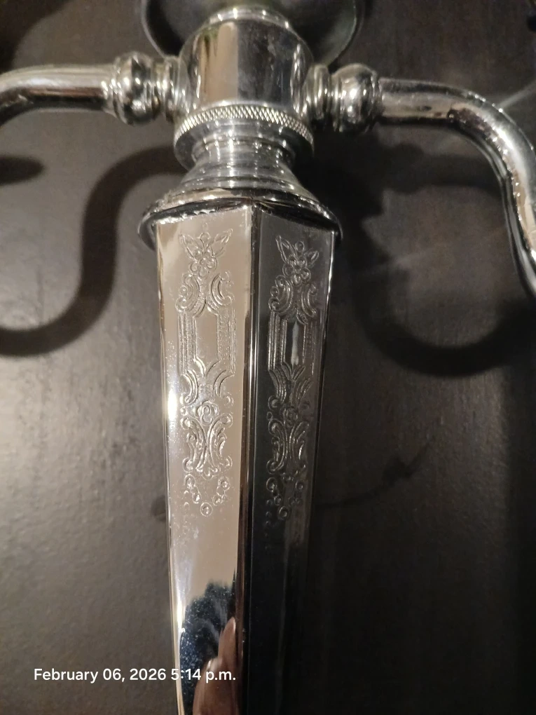 This silver tone (not real silver) candelabra holds three candles. It features decorative etching on the central column. A accent piece for any table!