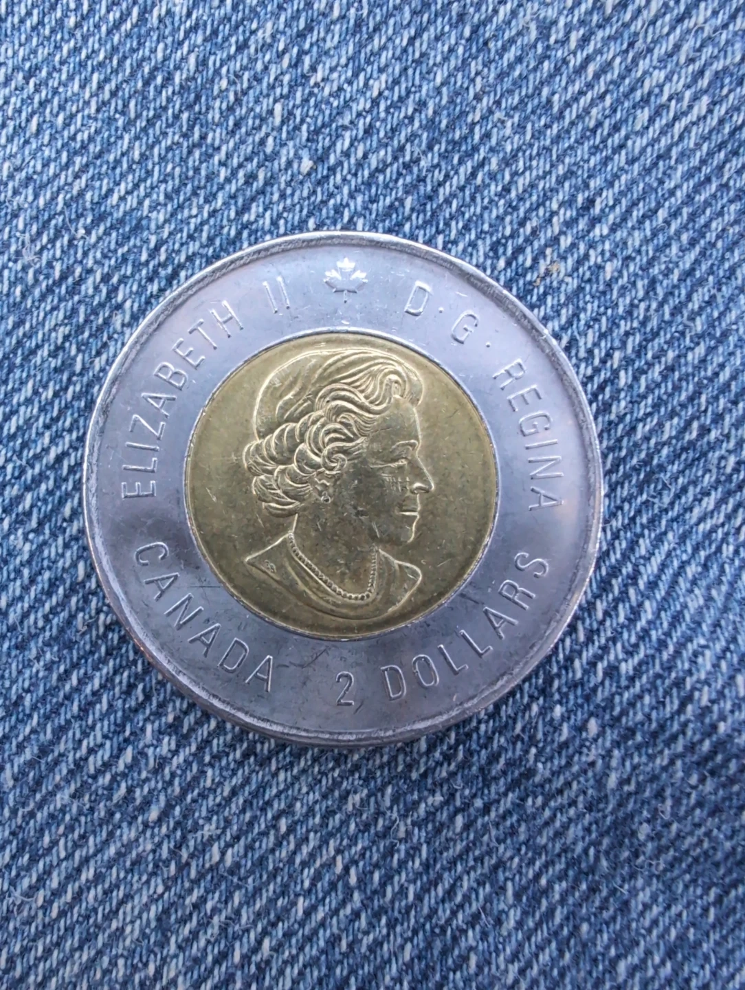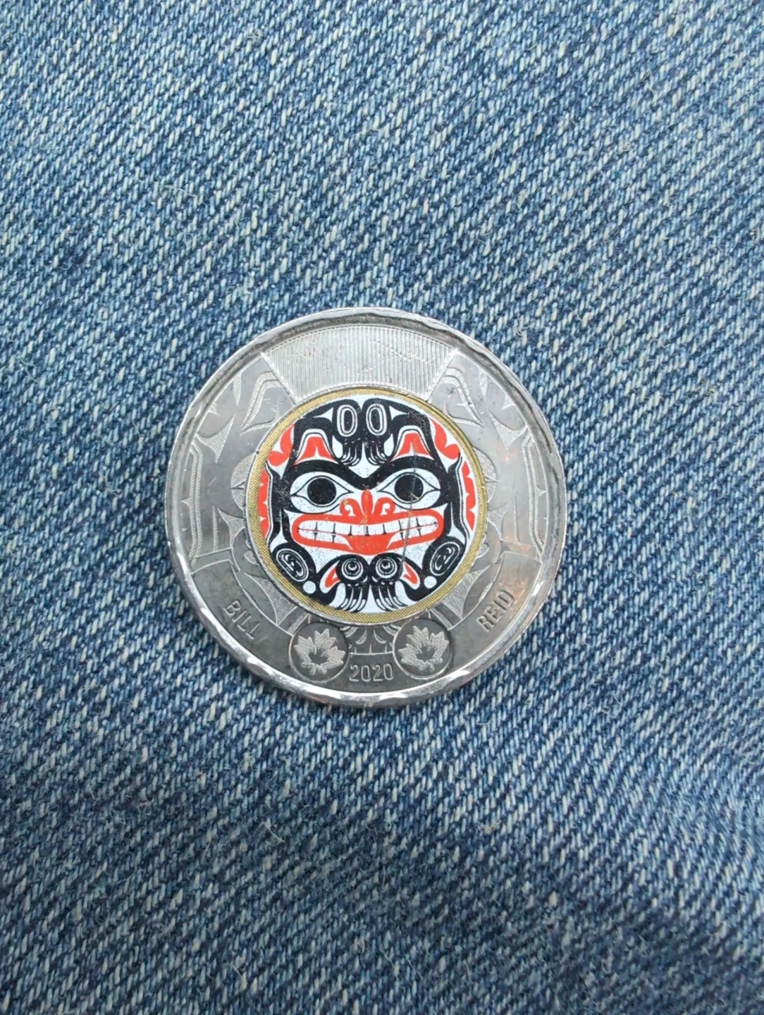 This is a 2020 Canadian two-dollar coin, also known as a toonie. It features a special design by Bill Reid. The reverse side displays Queen Elizabeth II.