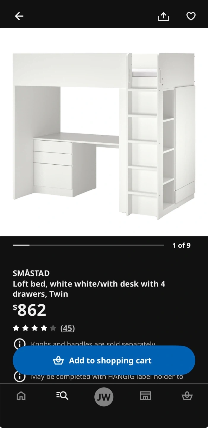 This is an IKEA SMÅSTAD loft bed in white, featuring a desk and four drawers. It includes shelves for storage and a built-in ladder for easy access to the top bunk. It's a great space-saving solution for bedrooms!