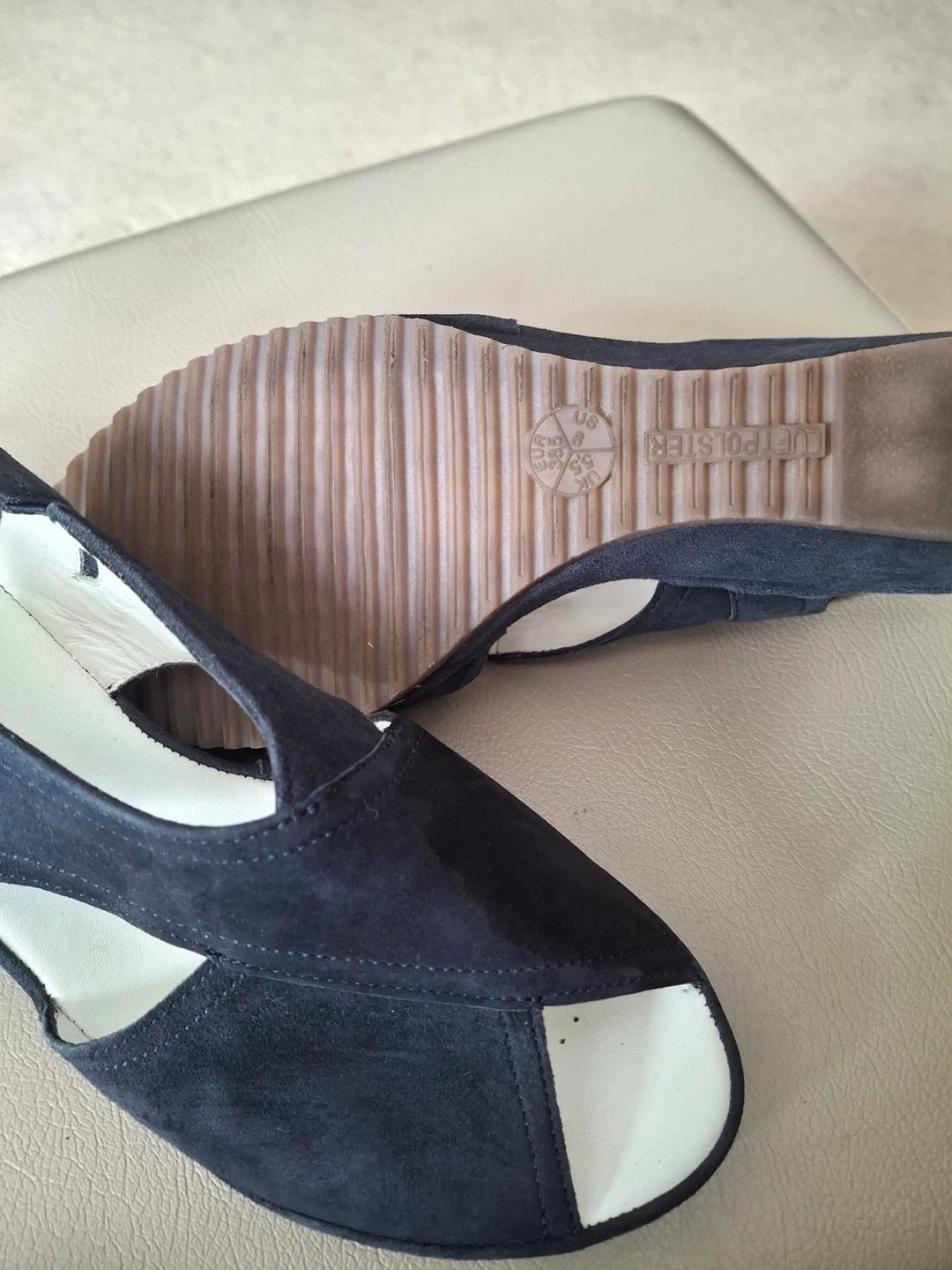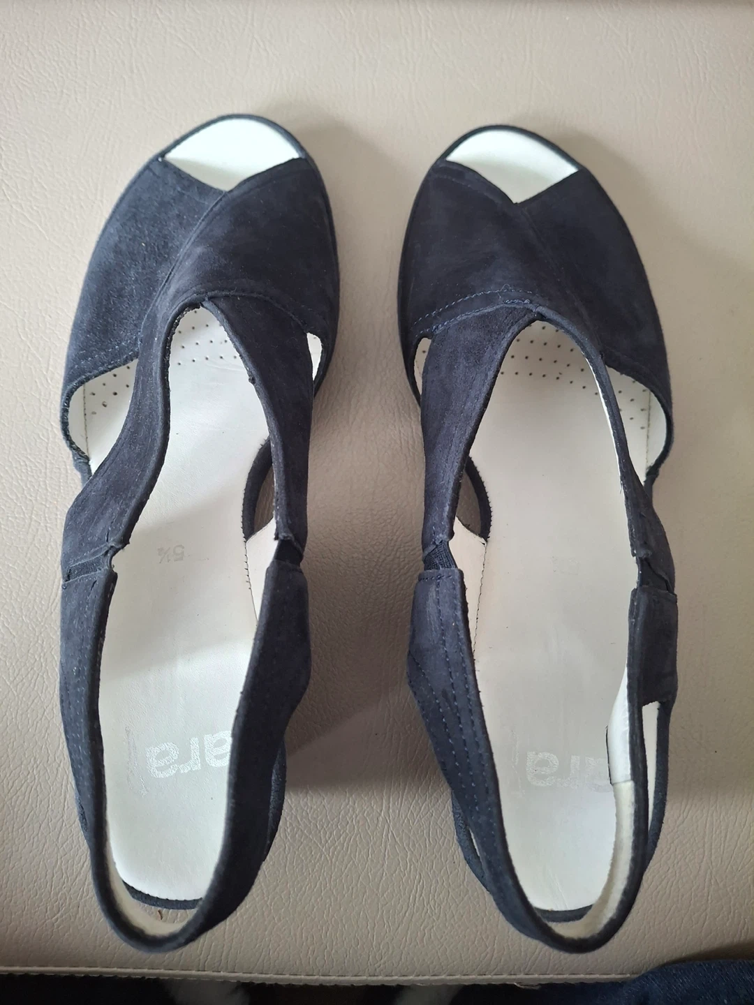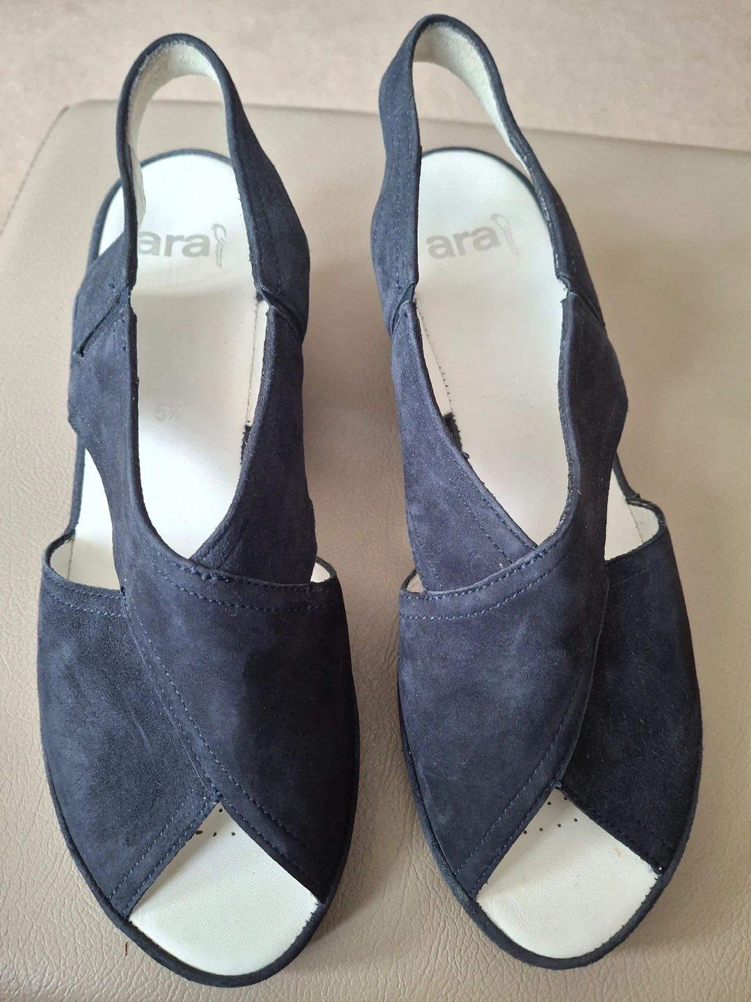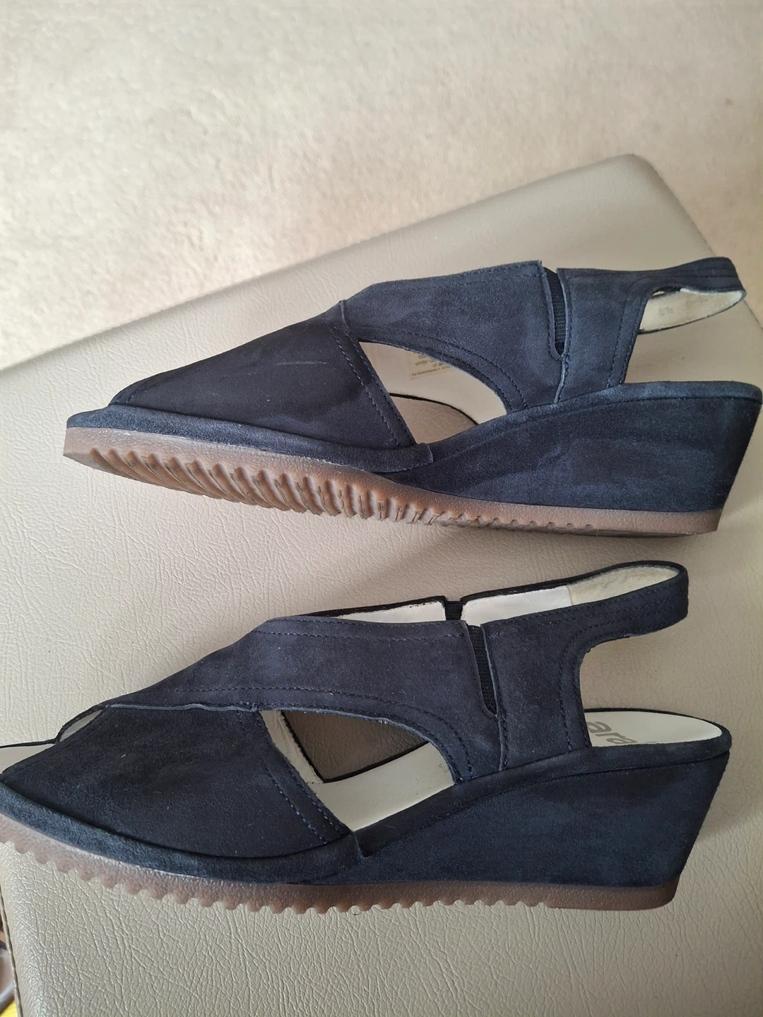 Navy suede sling back shoes with 2.25” wedge heel. Never been worn. Size 8, Eur size 38.5. Ara brand. One slight mark on one shoe as shown in photo.