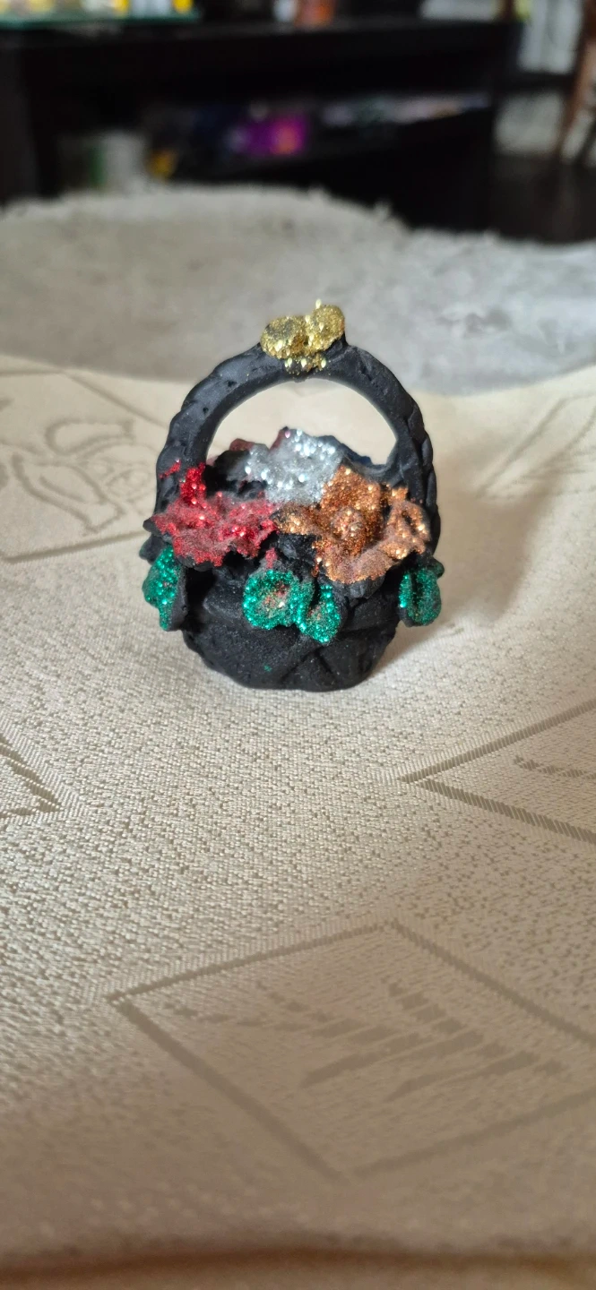 #gifting -Here's a cute mini decorative flower basket, perfect for adding a touch of charm to any room! It features a black woven basket design with colourful glittery flowers. It's in good condition and ready to brighten up your space.