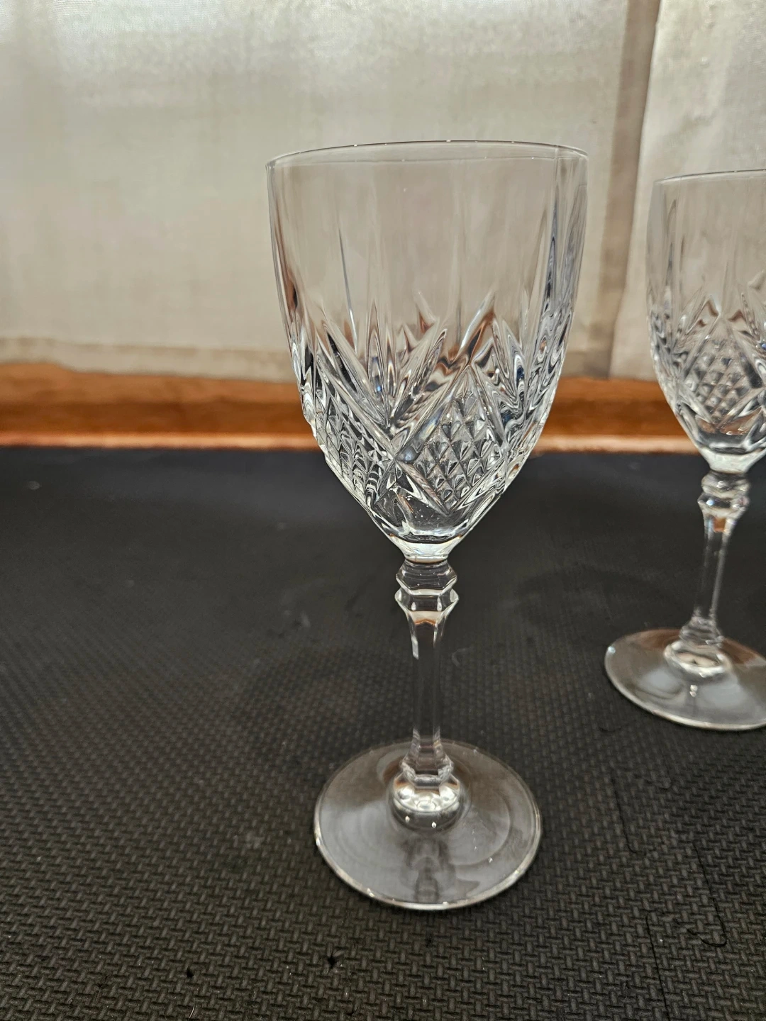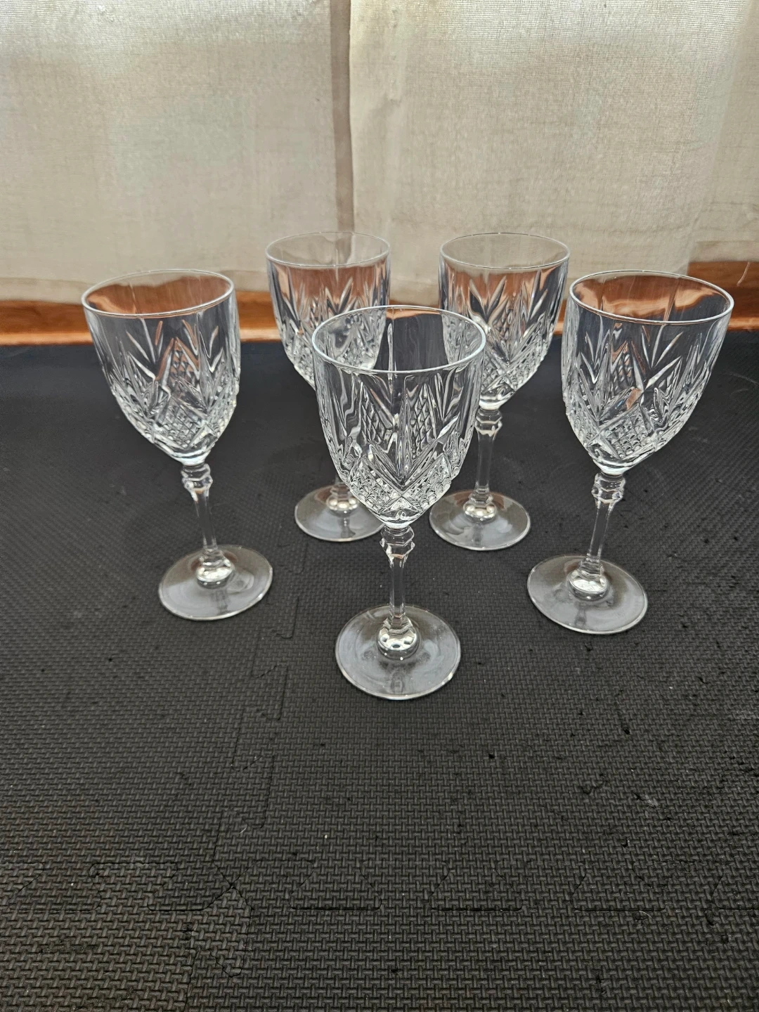 Selling a set of 5 crystal wine glasses. These elegant glasses feature a beautiful cut crystal design, perfect for adding a touch of sophistication to any occasion. They are in great condition and ready to be enjoyed