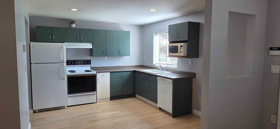 The unfurnished unit includes a spacious kitchen and in-suite laundry machines.