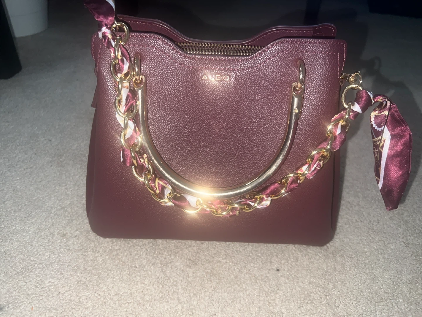 This is an ALDO handbag in a deep burgundy colour. It features a gold-tone chain detail interwoven with a decorative scarf. The bag has two top handles and a zip closure. It's a stylish accessory for everyday use.