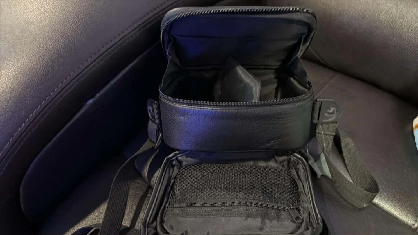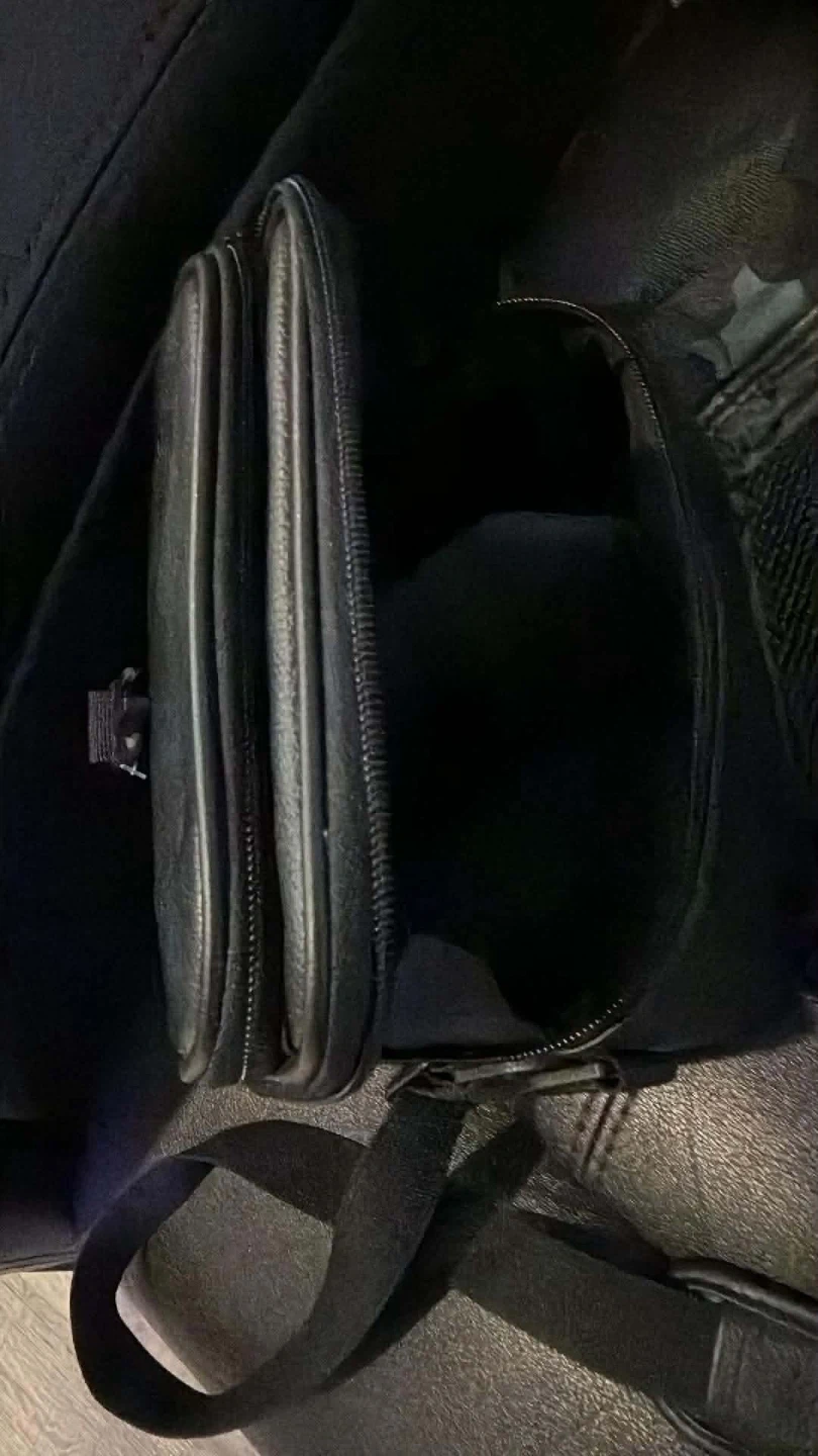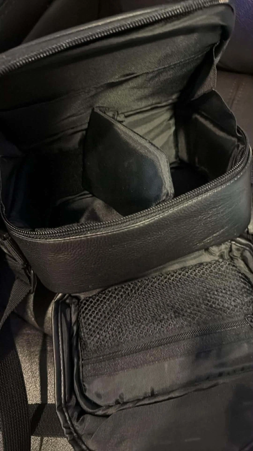 - Canon leather camera bag approx 3” depth by 6” across and has one removable divider in it
