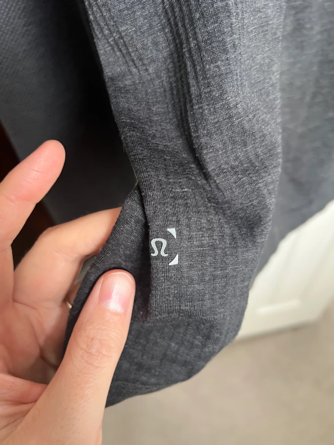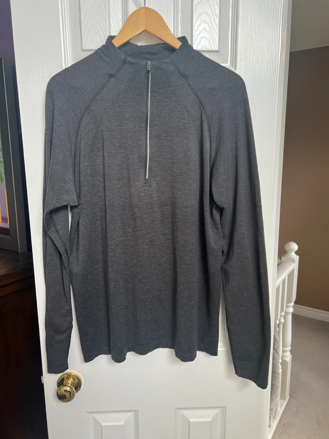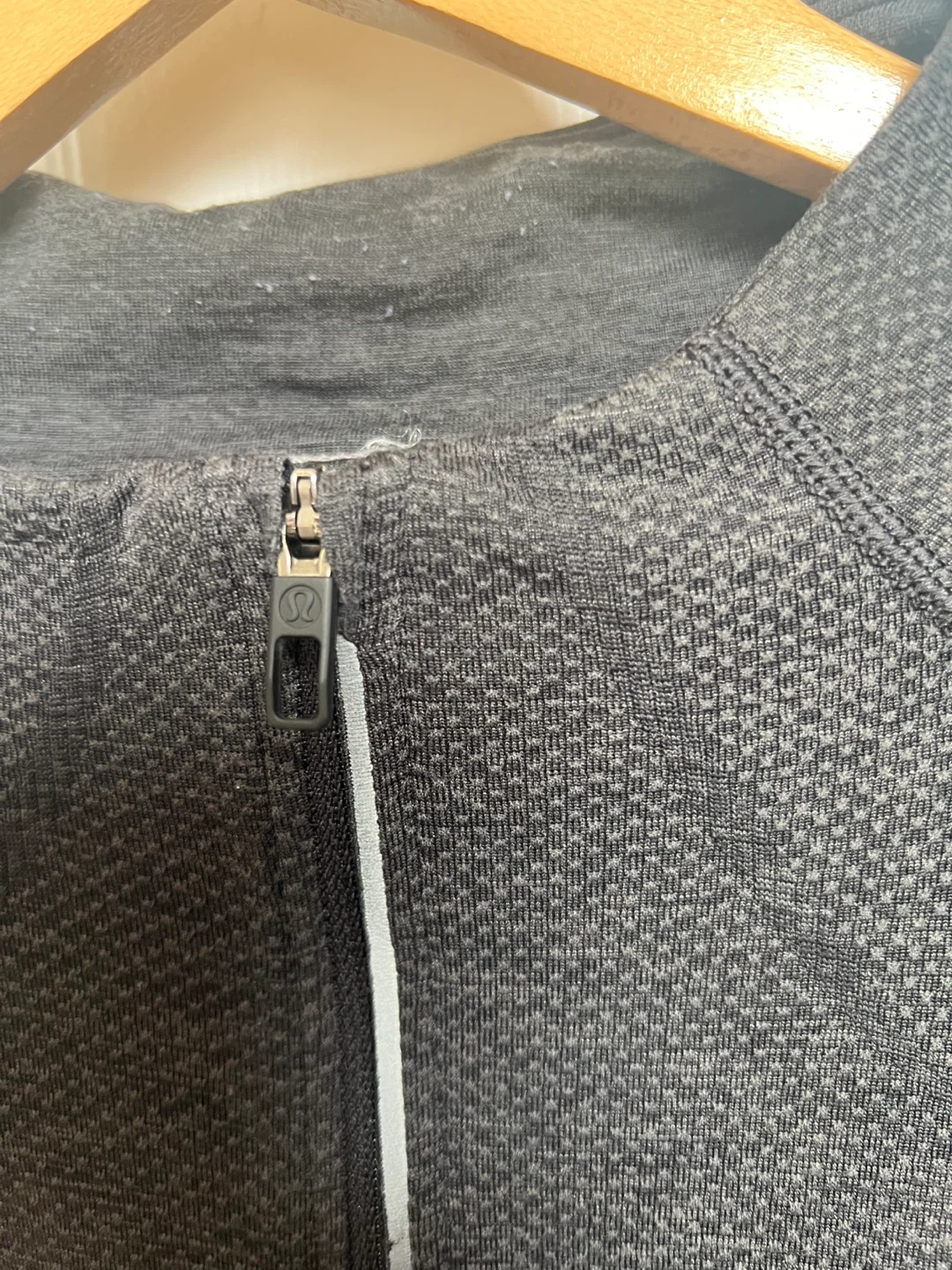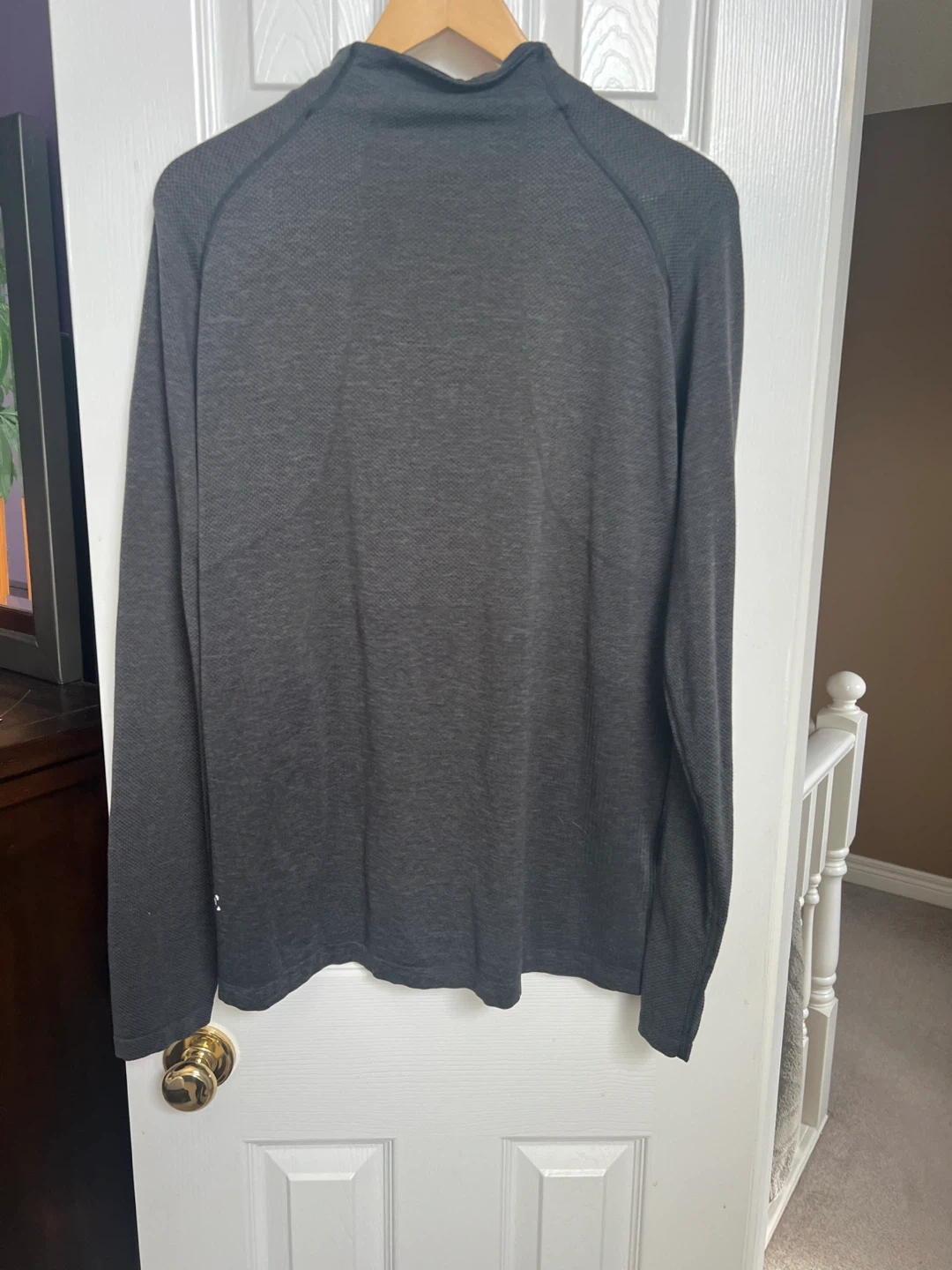 Lululemon men's quarter zip pullover in a dark grey heathered colour. It has a textured fabric and a reflective stripe detail along the zipper. It's great for workouts or casual wear.