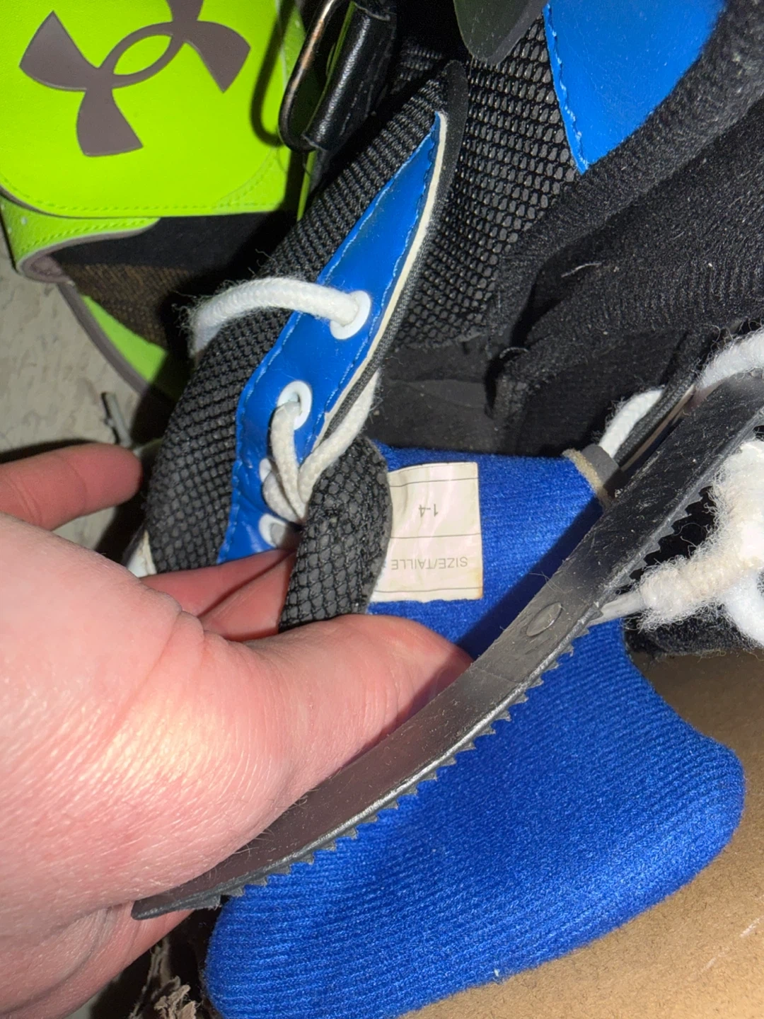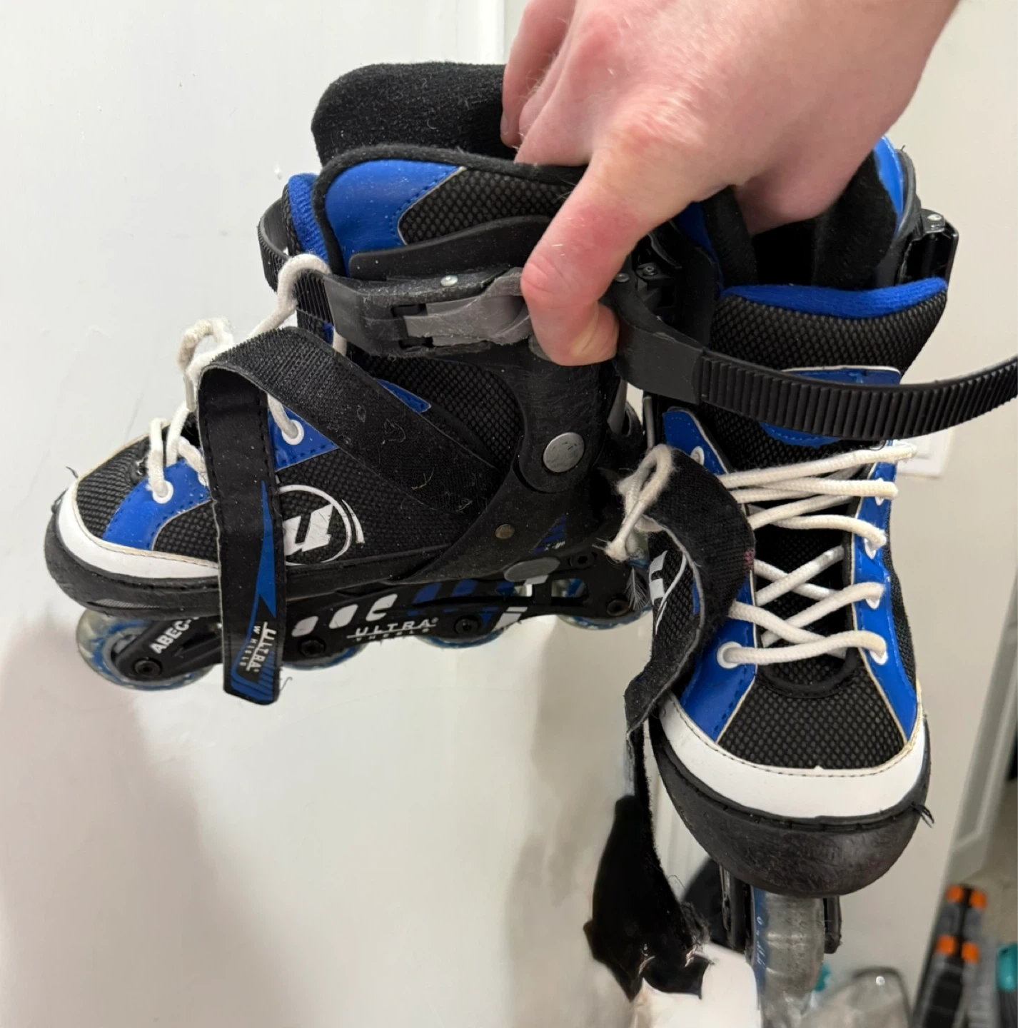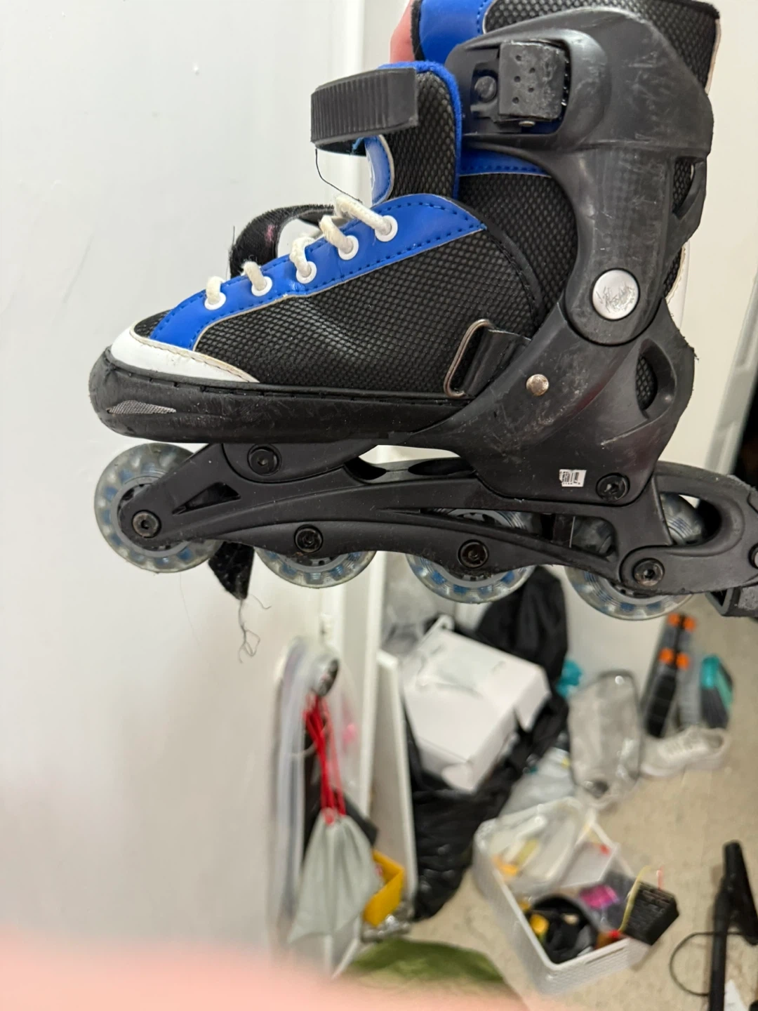 These rollerblades are blue and black with white laces and a velcro strap for extra support. The size label reads 1-4. They have four wheels per skate.