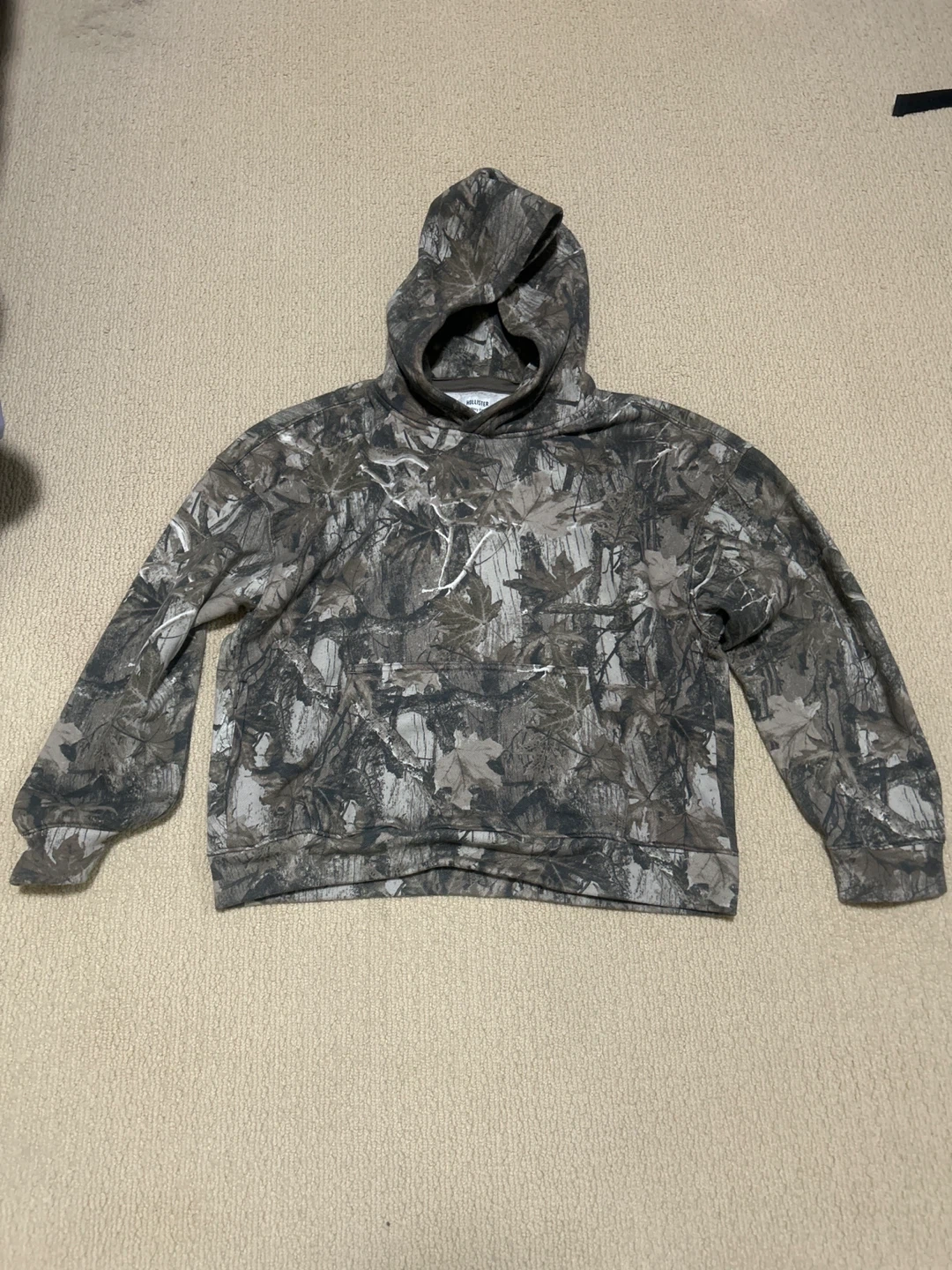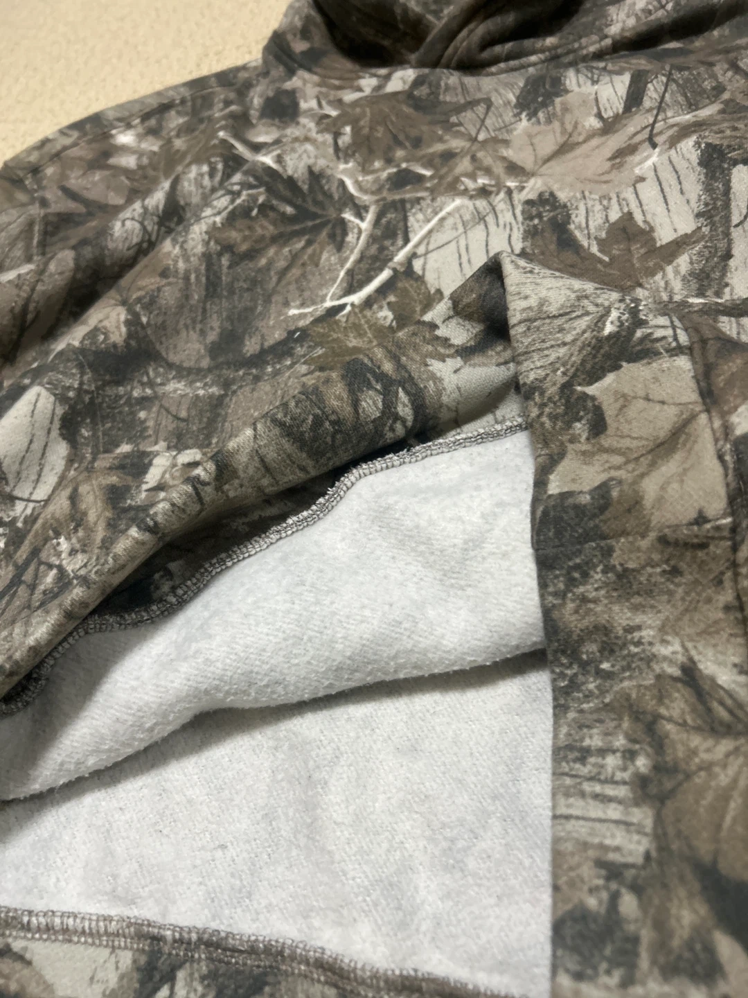 This is a Hollister camo hoodie with a boxy fit. It's a size small and made of a soft, fleecy material. Great for outdoor activities!