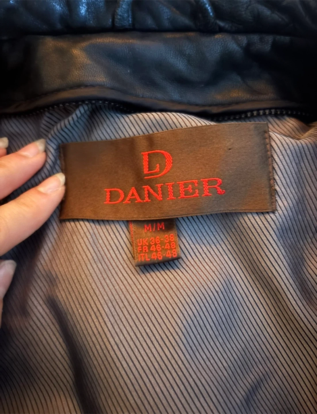 This is a black Danier leather jacket. It's a size M/M. The jacket has a zip-up front and two front pockets. It also features an inside pocket. It has a slight tear on the top of the collar.