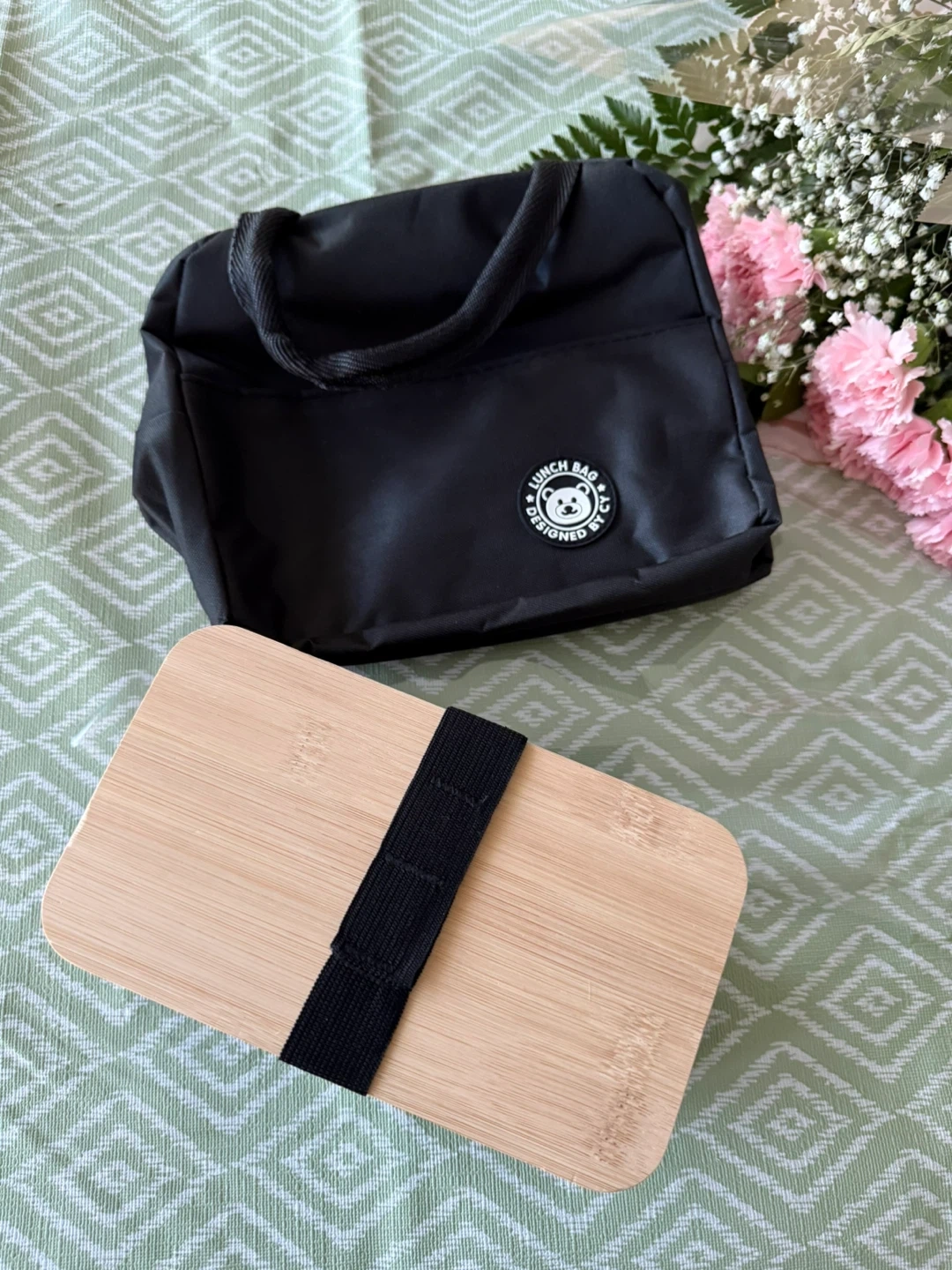 Also has a black insulated lunch bag and a matching black utensil set - fork, spoon, knife. Super handy for work or school lunches.
