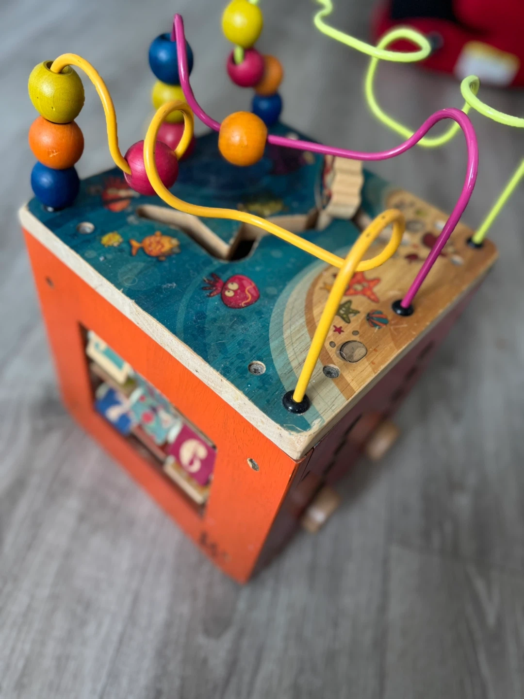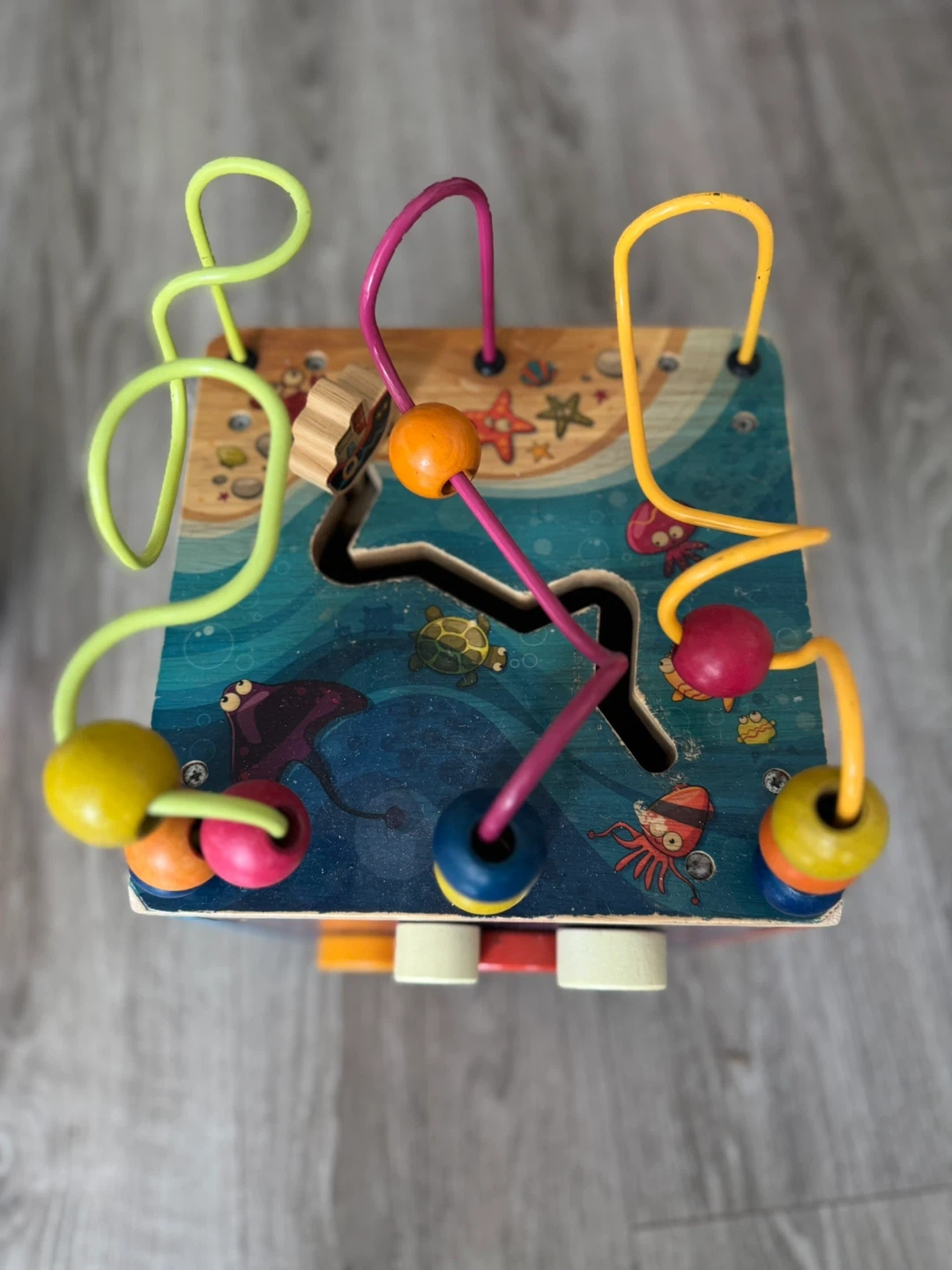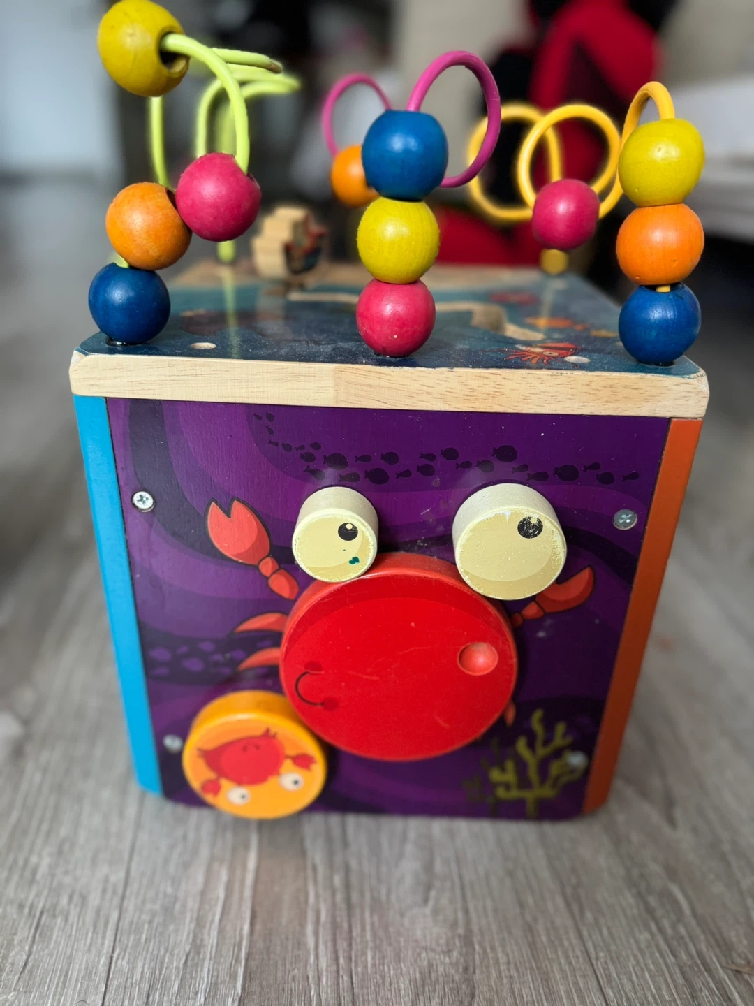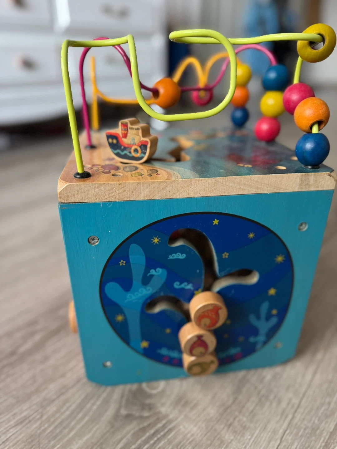 This is a wooden activity cube with a bead maze and various interactive panels. It's designed with a fun marine theme. Great for developing fine motor skills! Keeps the baby busy and entertained for a very long time..