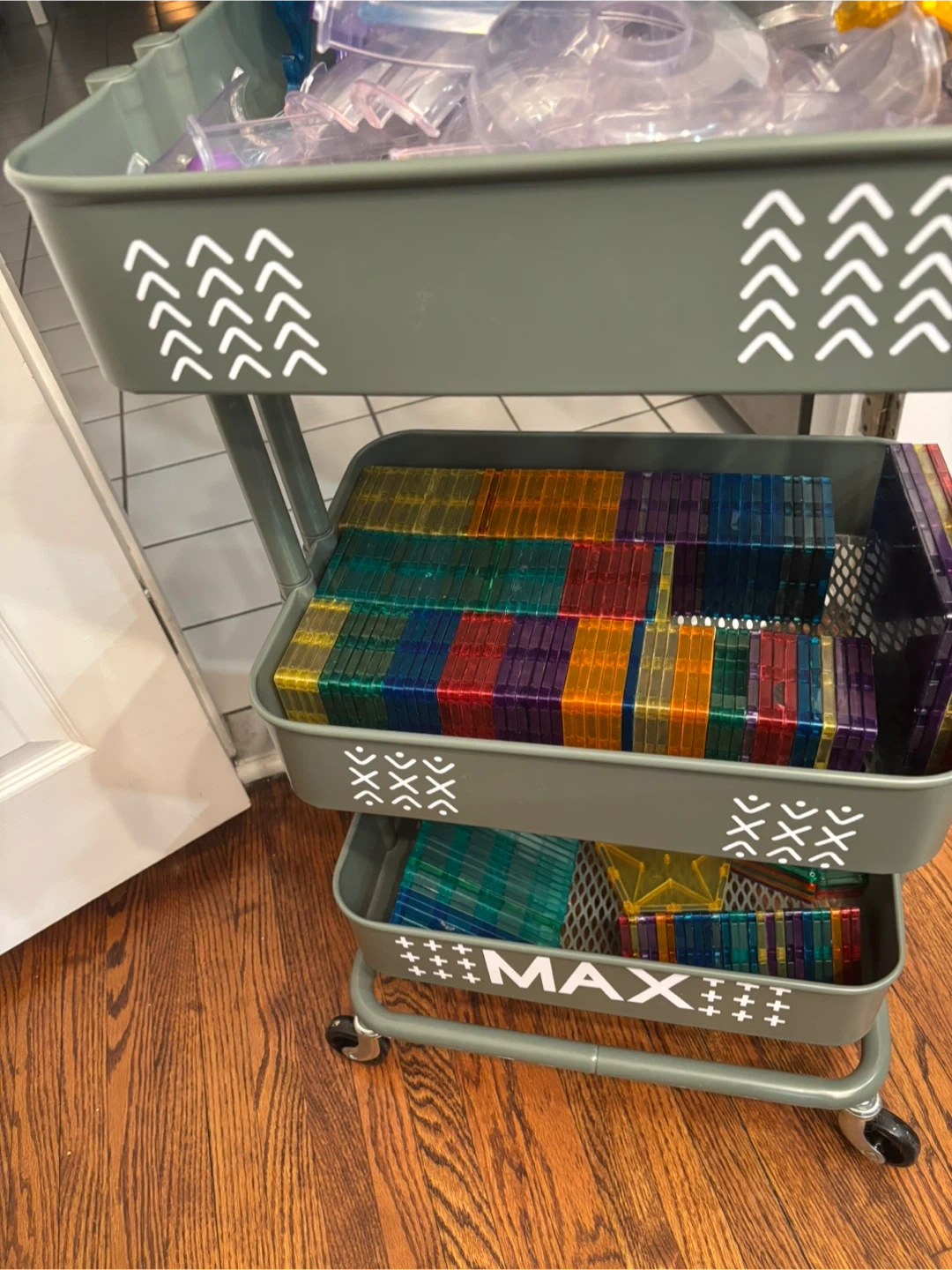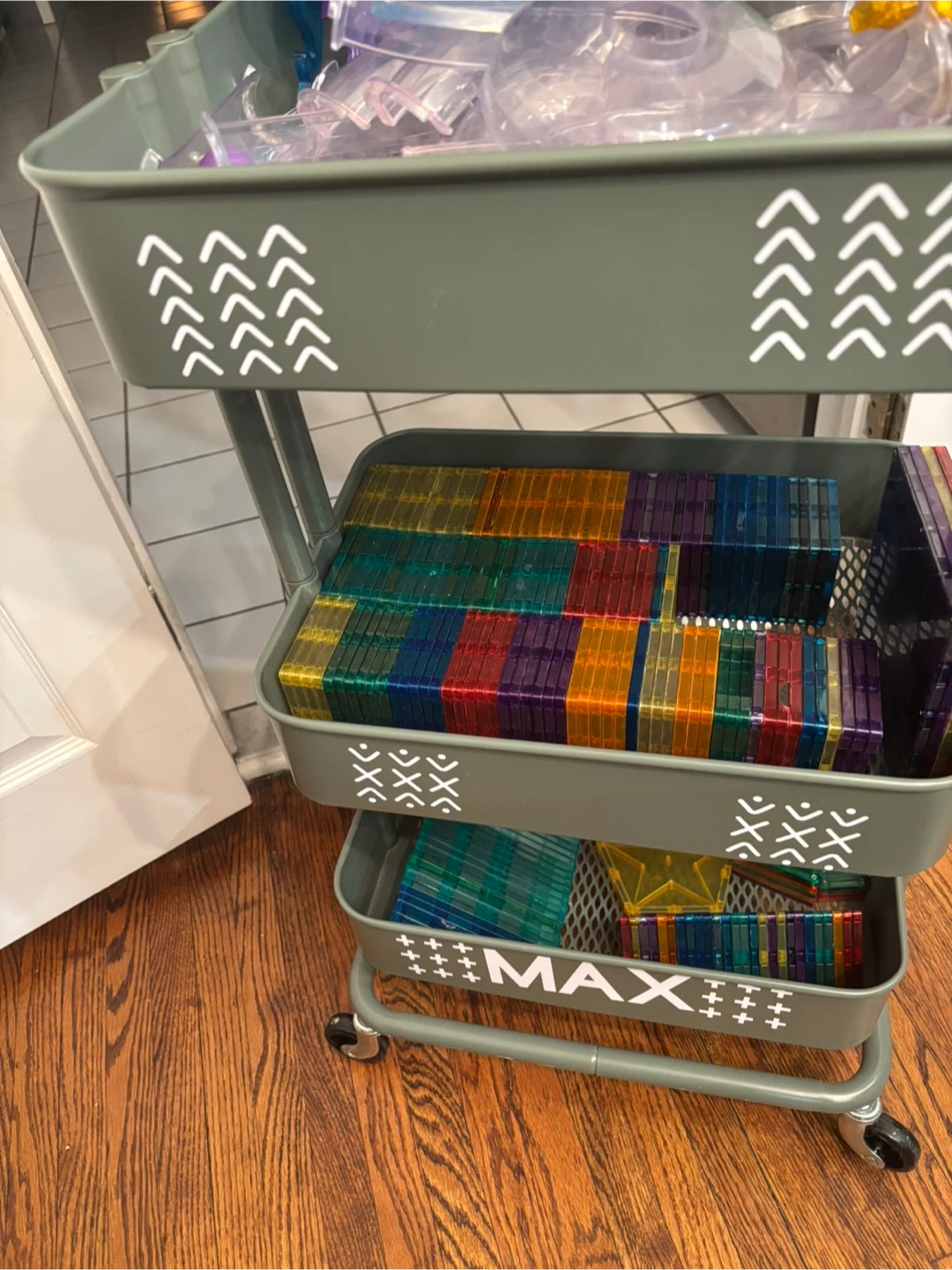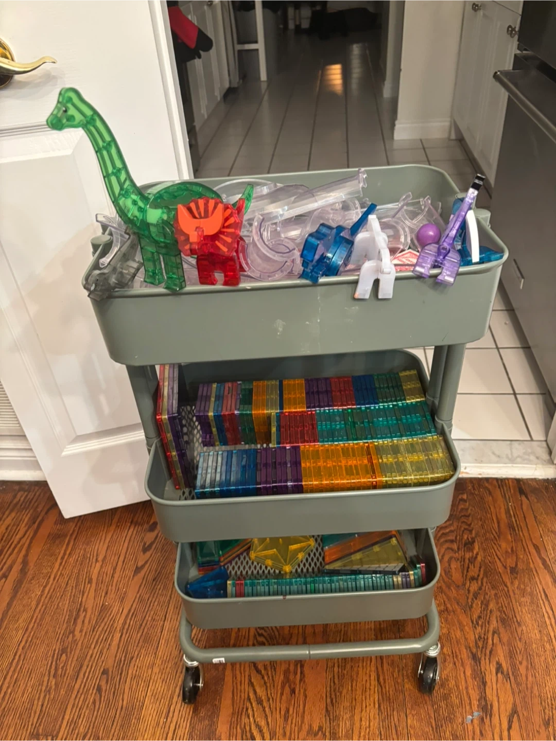A large collection of magnetic building tiles in various colours. It also includes some dinosaur and figure accessories. Great for creative play!
