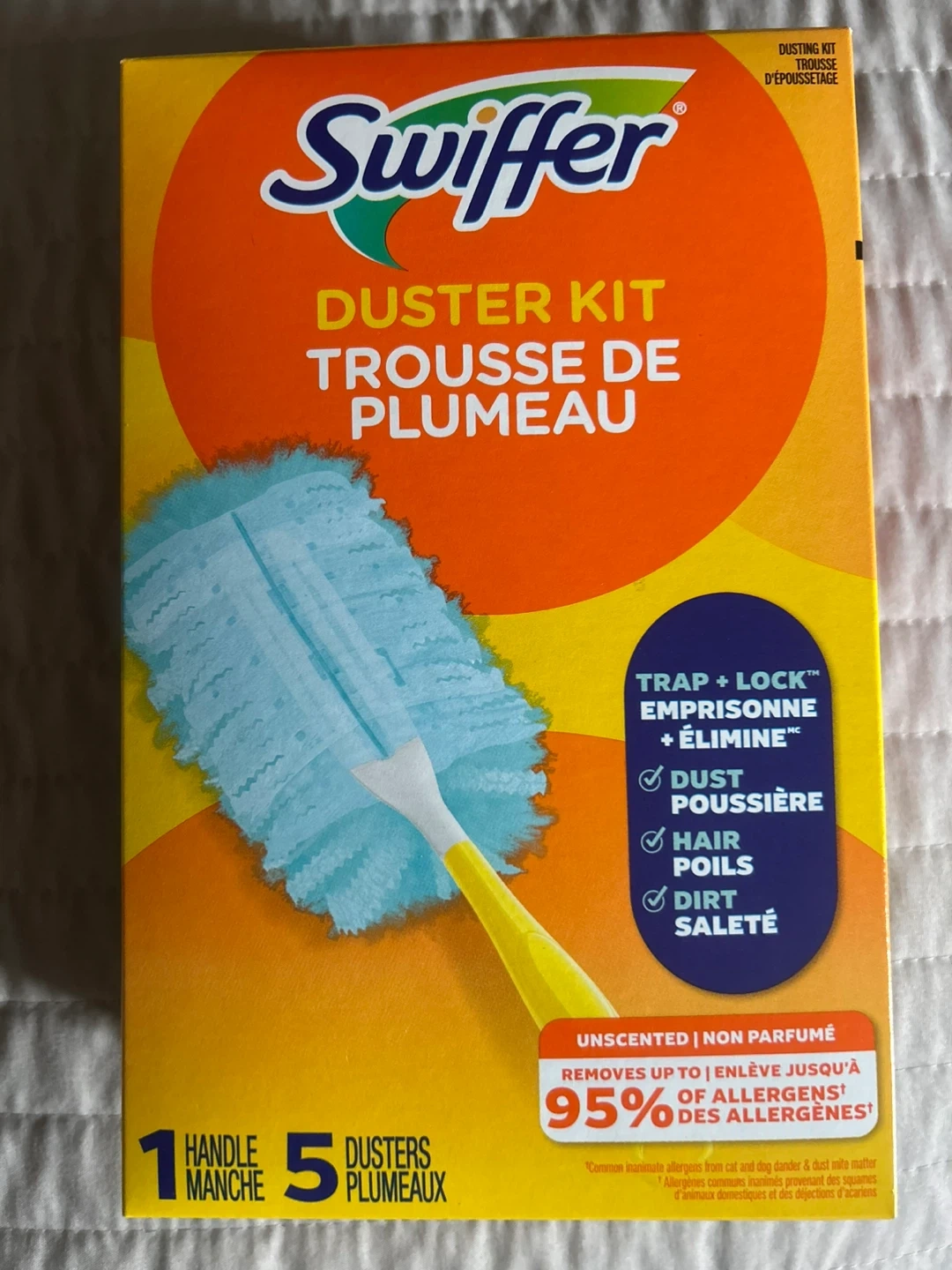 This Swiffer Duster Kit includes one handle and five dusters. It's designed to trap and lock dust, hair, and dirt. Unscented and non-perfumed, it removes up to 95% of allergens!
