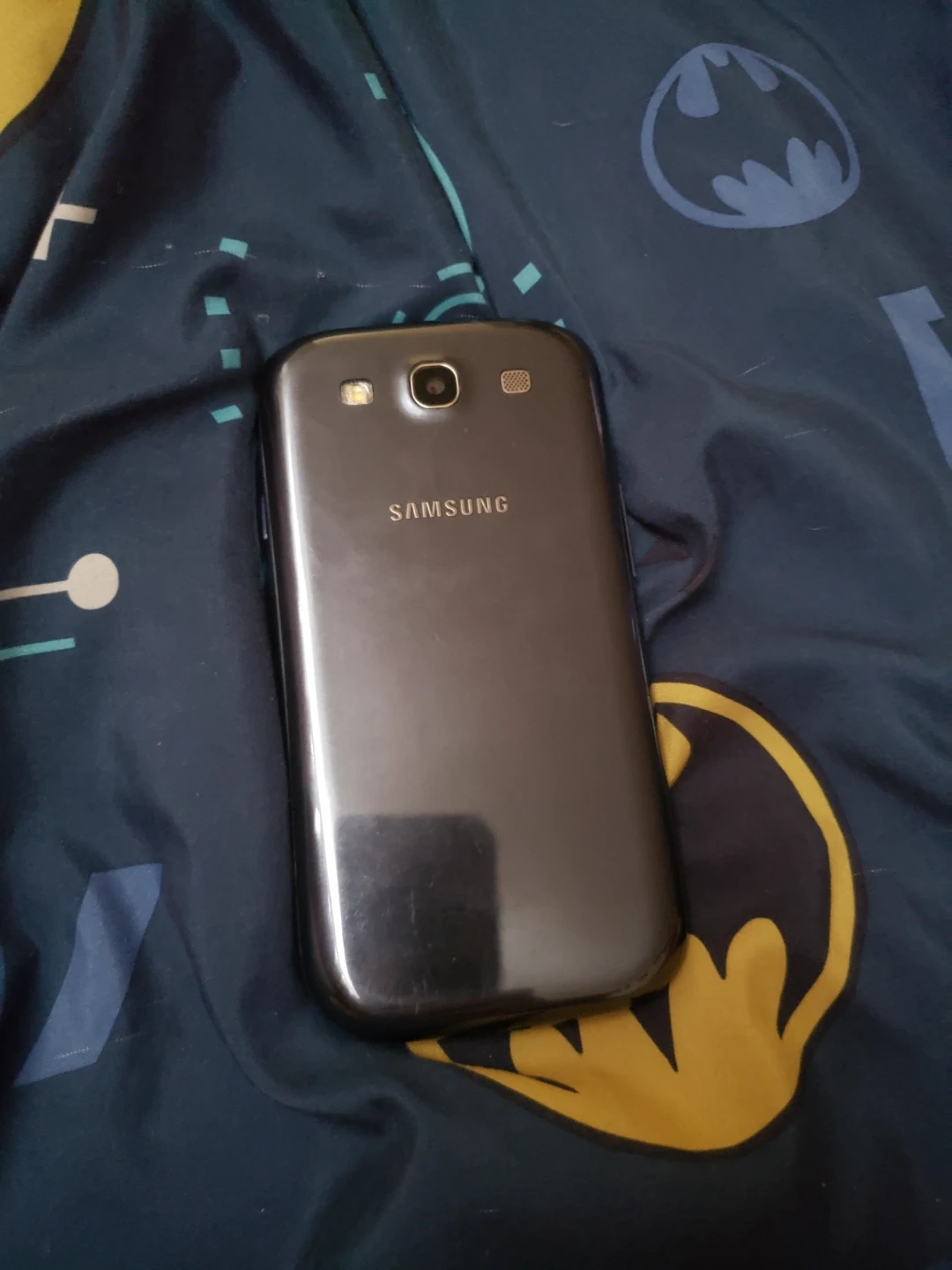 Samsung Galaxy S3 smartphone in dark grey. It's a classic Android phone with a decent camera and touchscreen. The battery is removable and it has slots for SIM and SD cards. Perfect for basic calls and texts!