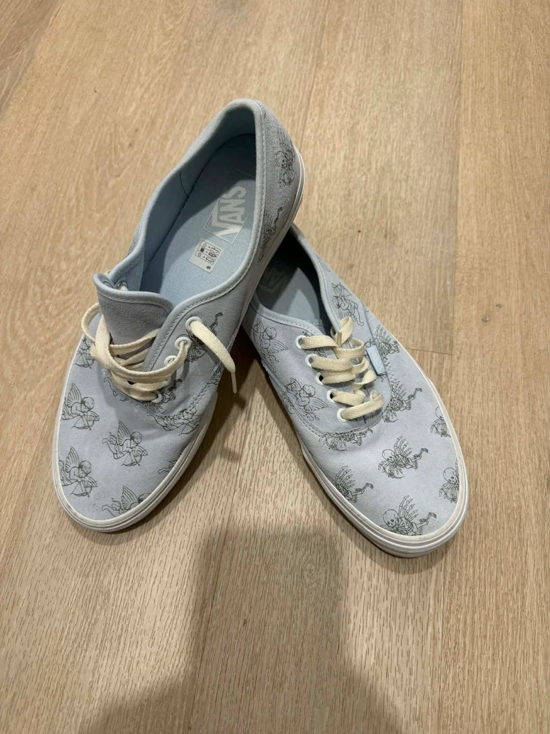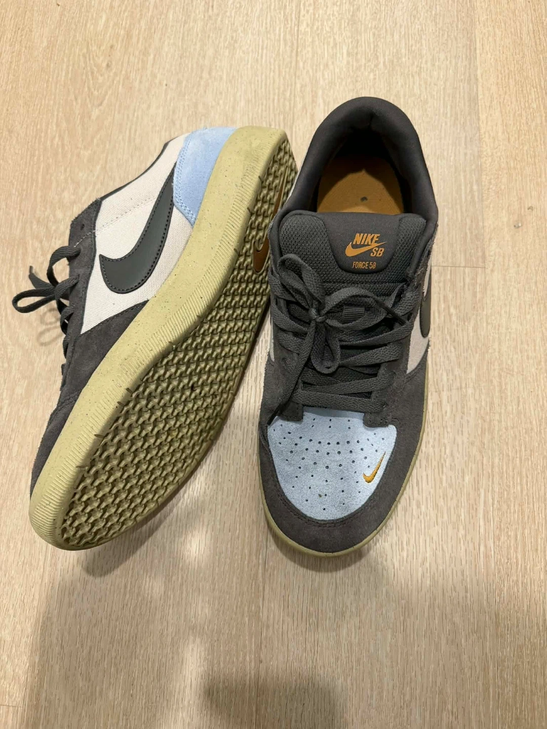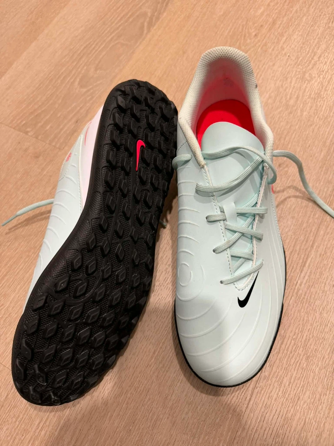 These Nike Mercurial Vapor 14 Academy Turf shoes are light blue. They feature a rubber sole for traction. Great for playing soccer on artificial turf!
