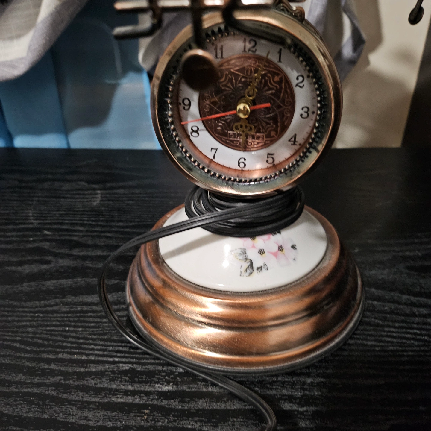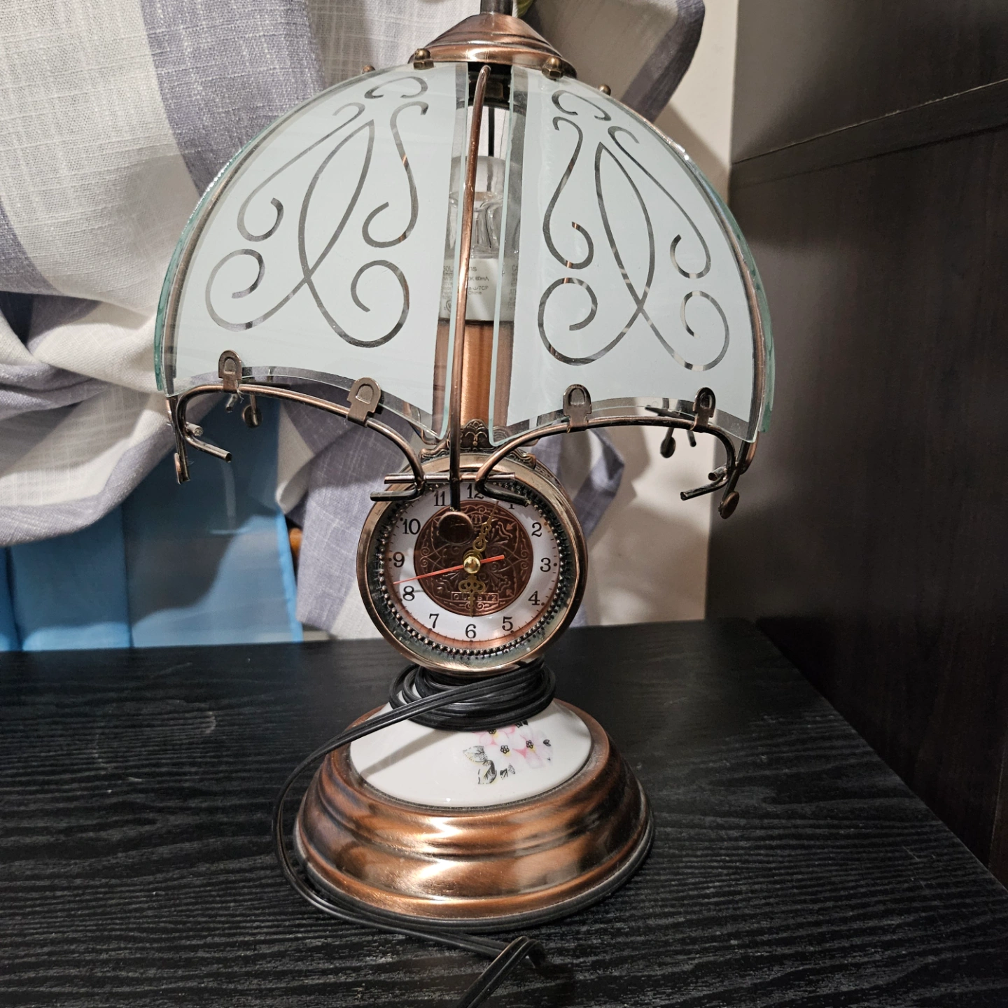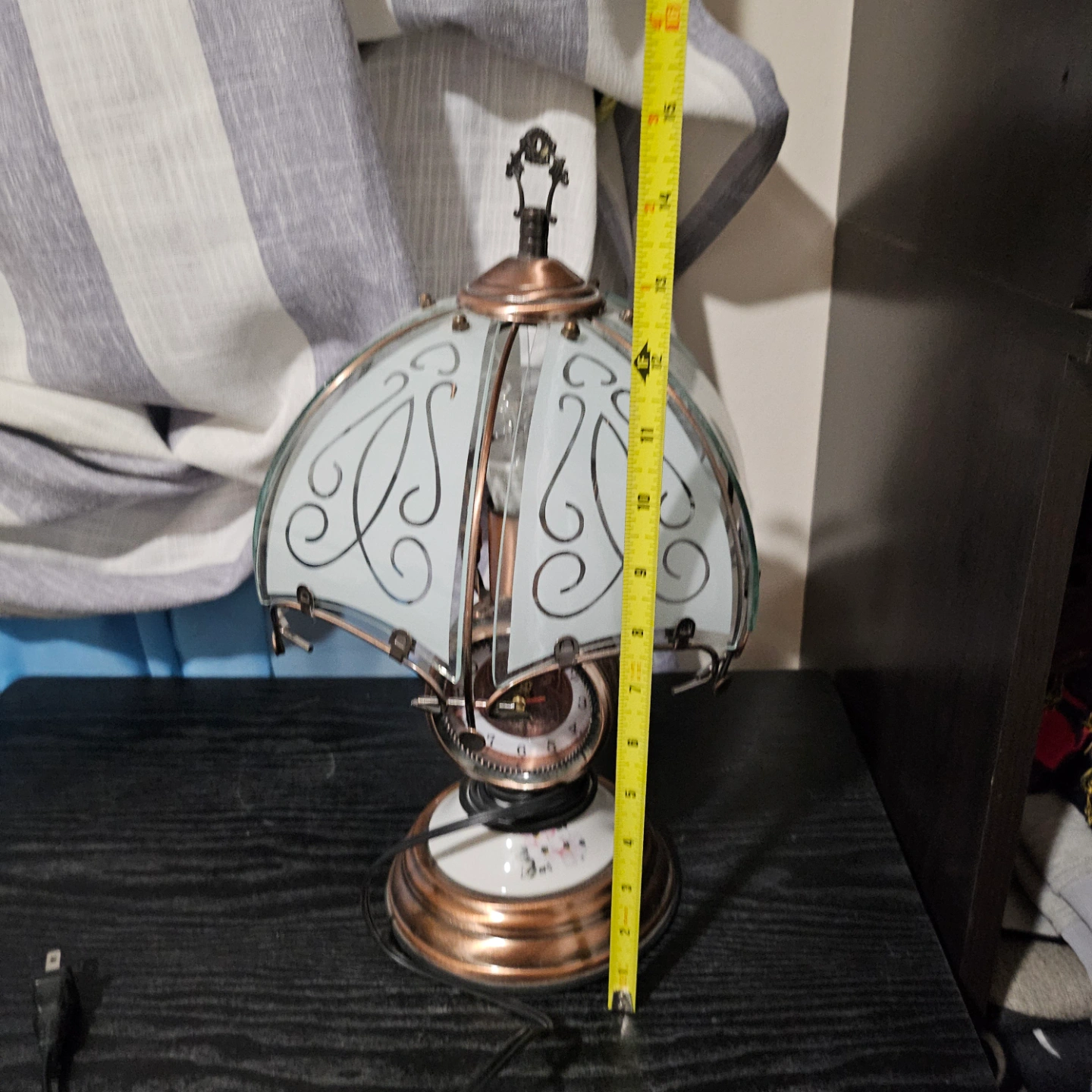 Unique table lamp features a frosted glass shade with ornate detailing. Bronze-tone metal base houses a working clock. Cord included. Measures approximately 17 inches tall.