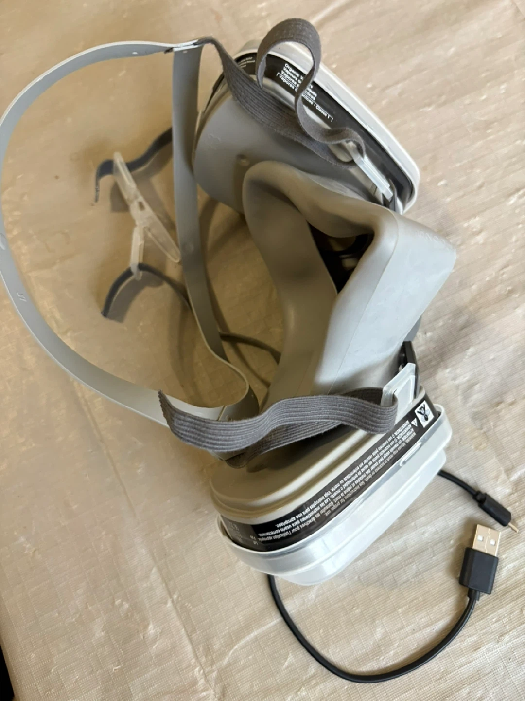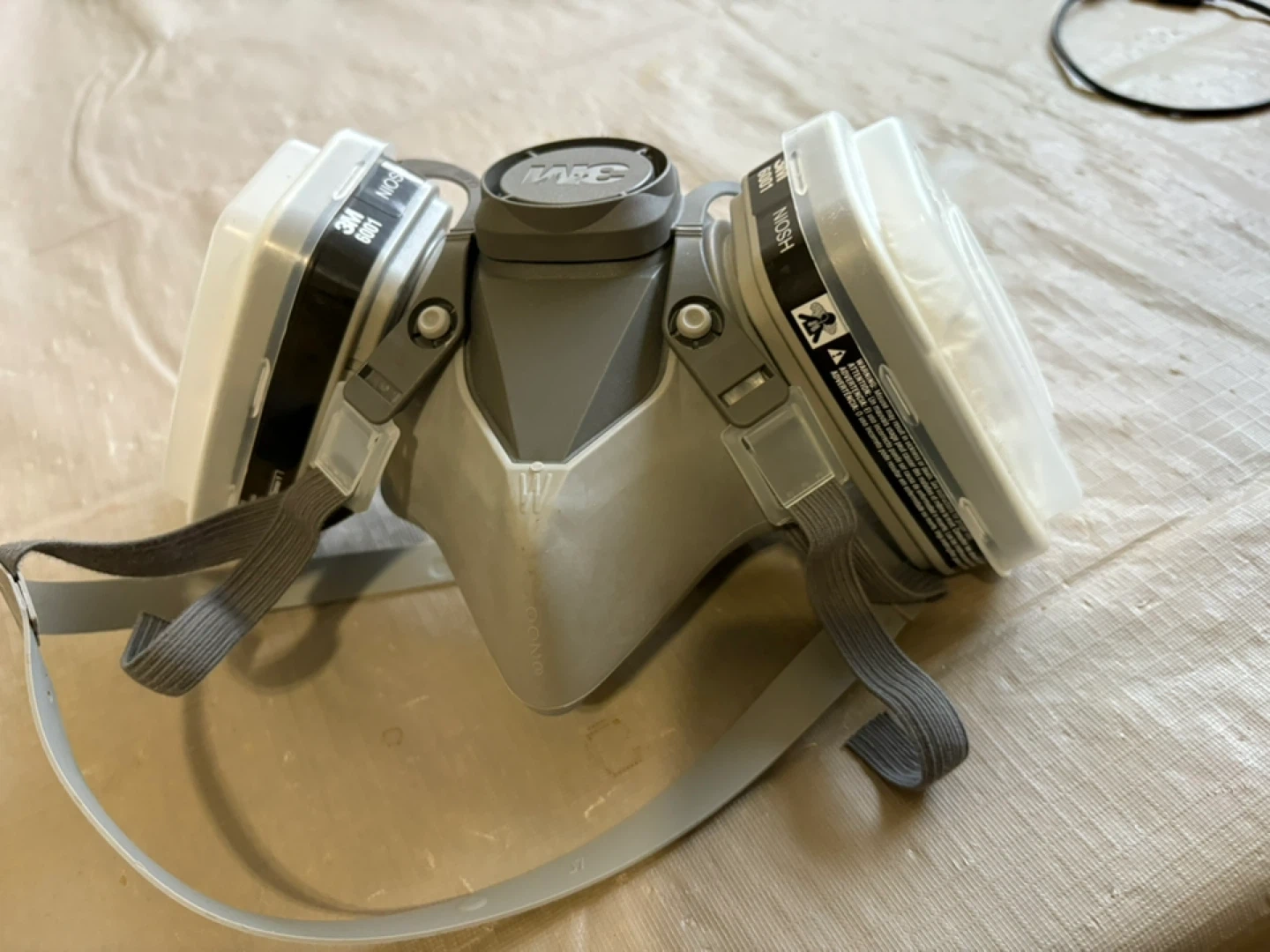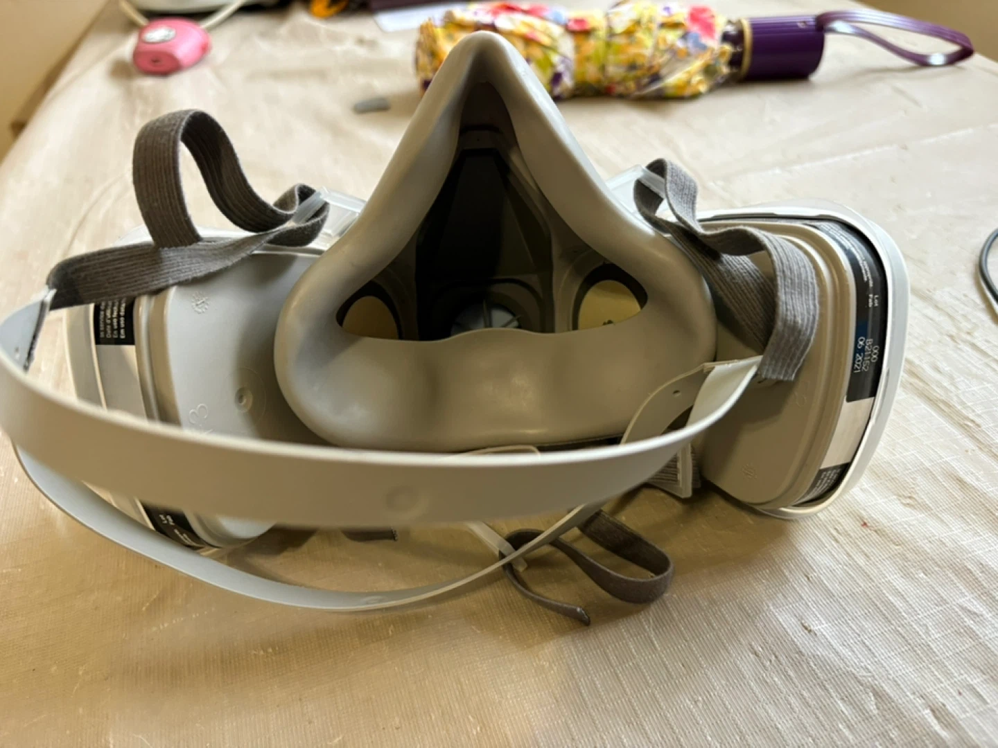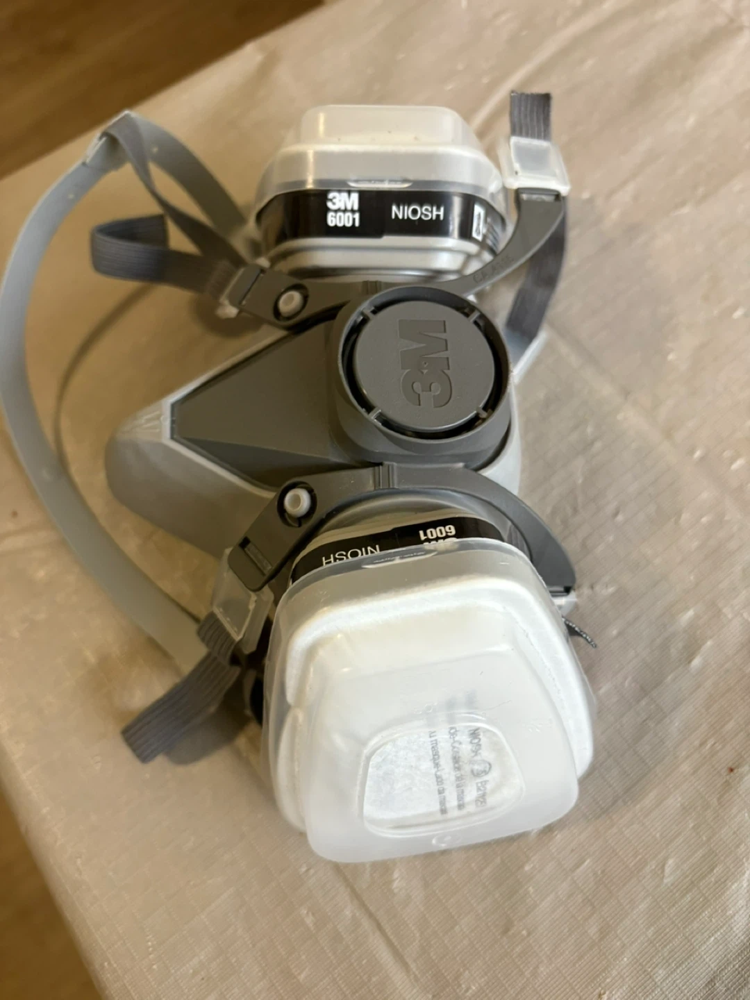 This is a 3M 6001 reusable respirator mask with adjustable straps. It's made of durable grey silicone for a comfortable fit. Filters are attached, ready for use.