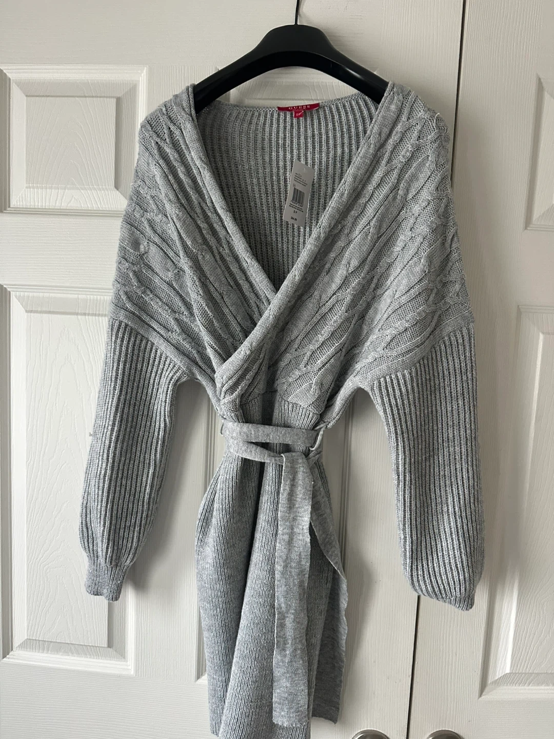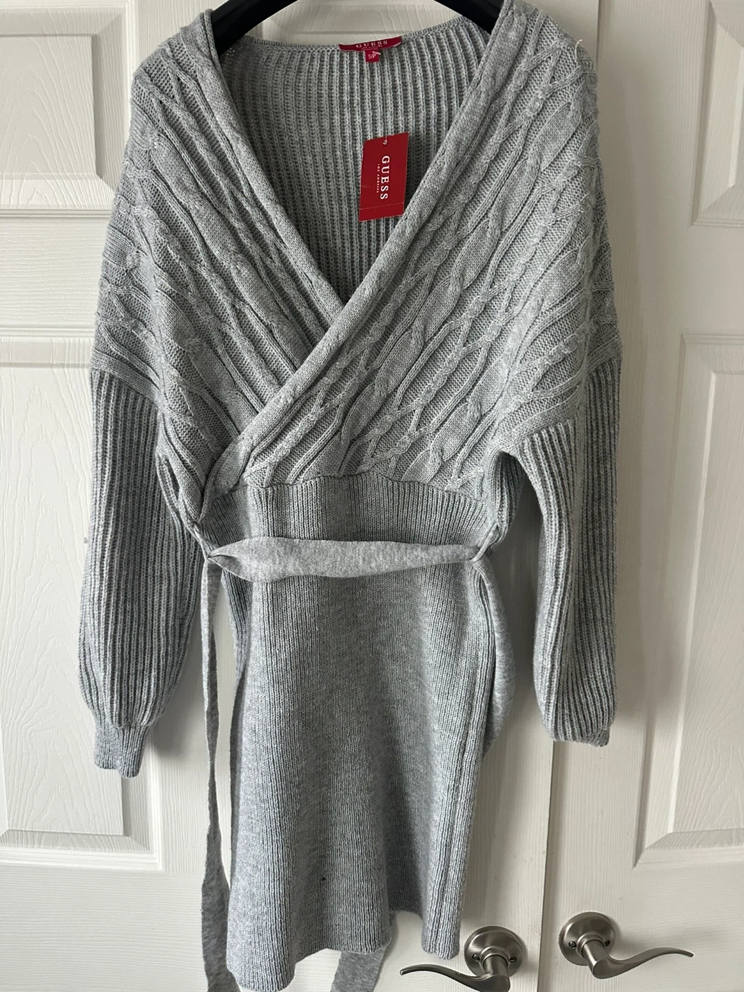 Guess wrap sweater dress in a light melange grey colour. It's a size S/P. Features a tie belt and a cable knit design on the sleeves and shoulders. Made from a cozy knit material.