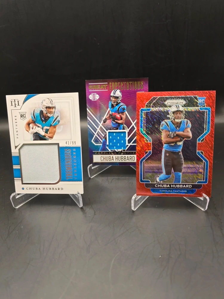 Selling a collection of Chuba Hubbard Carolina Panthers trading cards, includes Red Shimmer /35. These cards are in great condition and would be a great addition to any sports card collection! Check out the photos for details