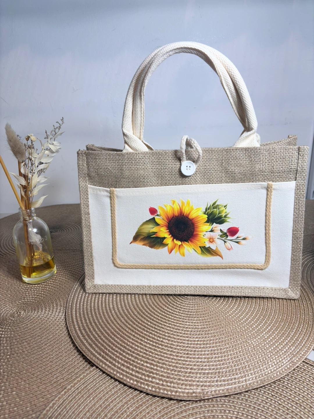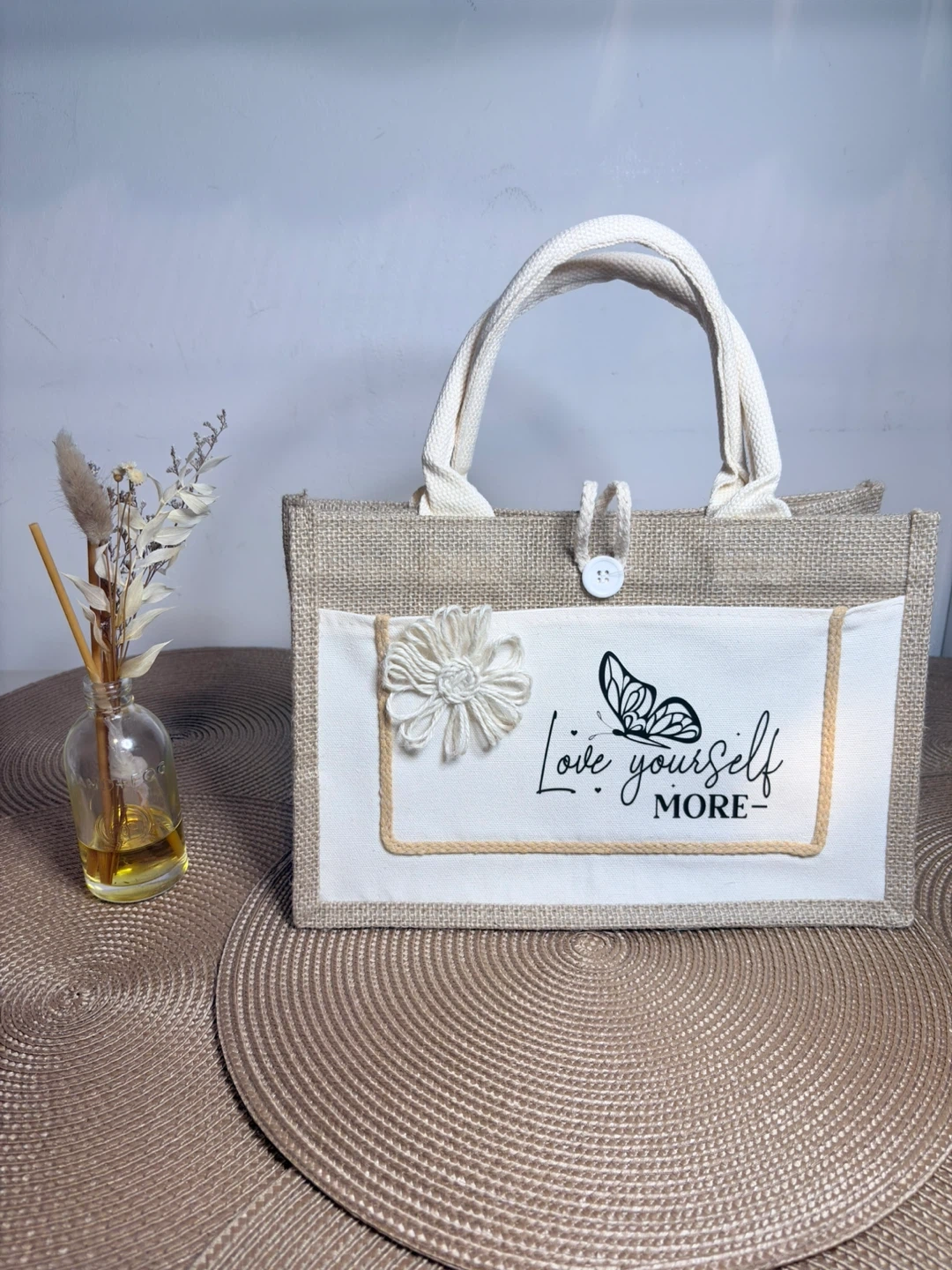 This charming jute tote bag features a colorful sunflower design on one side and a butterfly with the phrase 'Love Yourself MORE' on the other. It has sturdy canvas handles and a front pocket for easy access. The natural jute material offers a rustic yet stylish look, perfect for everyday use.