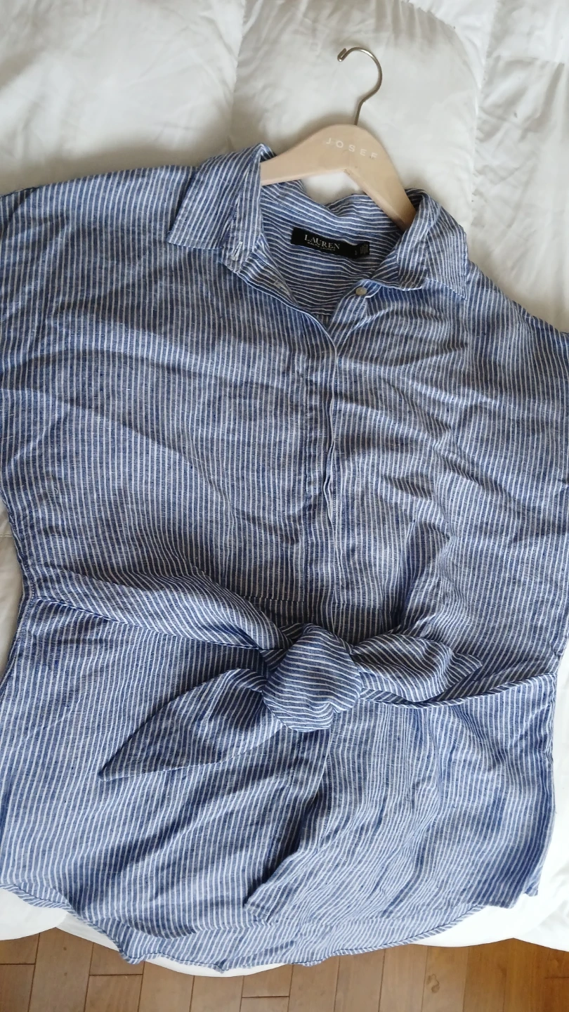 Beautiful ladies pinstripe blue blouse size large for $5.00. It's in excellent condition and no damage. I bought it about five years ago for an outdoor party. Just clearing my closet. Needs a gentle wash. Porch pickup at Dufferin and Bloor st.