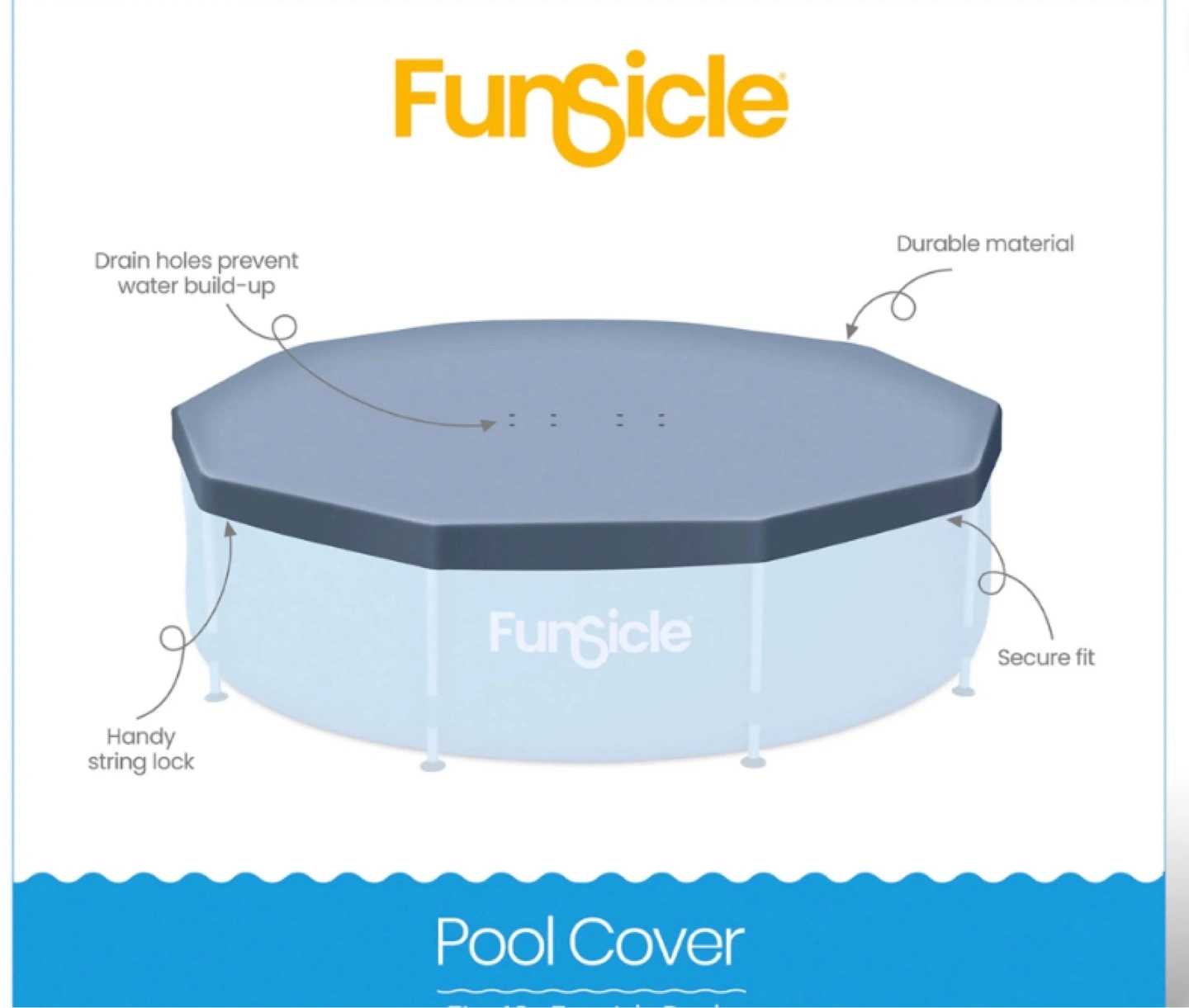 Keep your pool clean and protected with this brand new FunSicle pool spa cover, designed to fit 14ft to 15ft pools. Made with durable material and featuring drain holes to prevent water build-up, this cover ensures your pool stays in top condition. It also includes a handy string lock for a secure fit.