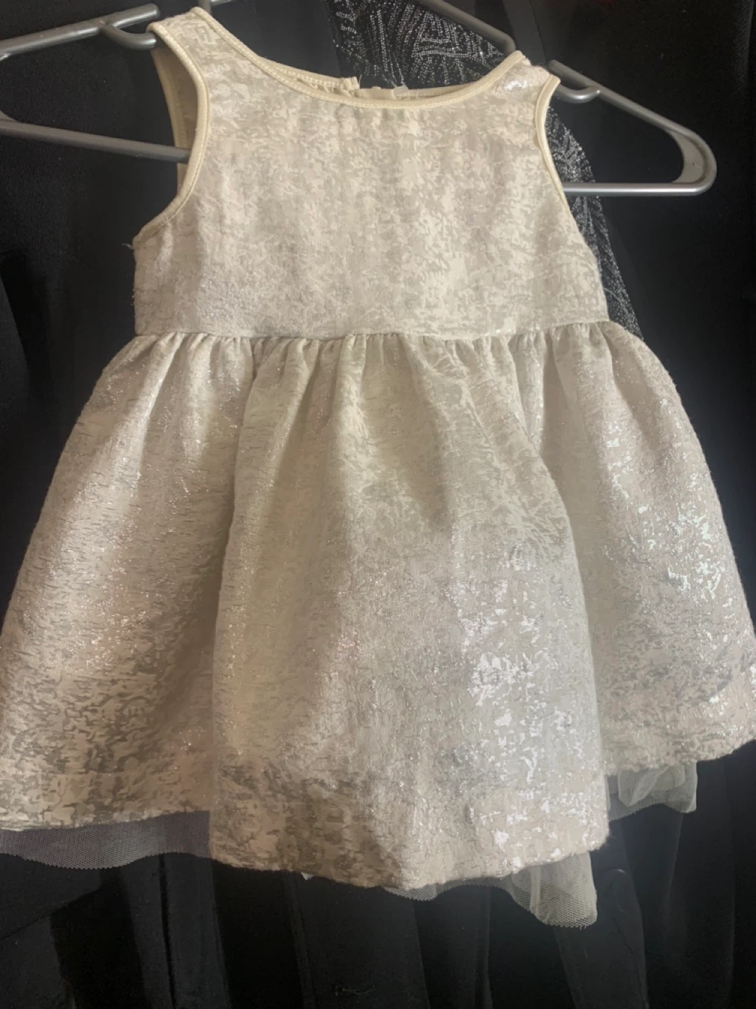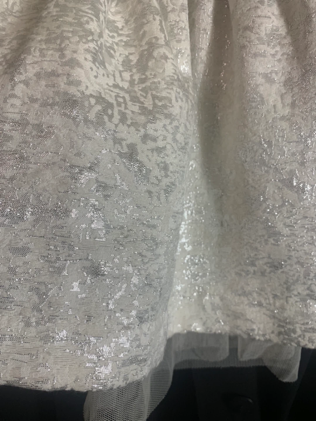 STUNNING!! Photo doesn’t capture this gorgeous dress. This is sleeveless with a textured white brocade fabric. It has a gathered waist and a simple A-line skirt with a tulle underlay. The fabric has a high shimmer. It's perfect for a wedding, parties or special occasions! Can arrange mutual p/u location.