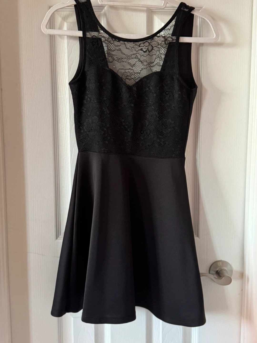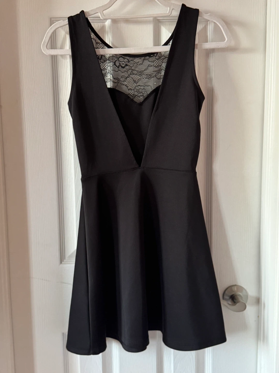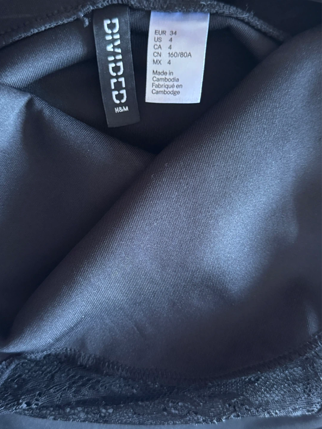 This is an H&M Divided black sleeveless dress with lace detailing on the neckline and back. It's a size 4, made in Cambodia. The fabric is a blend, offering a nice drape.
