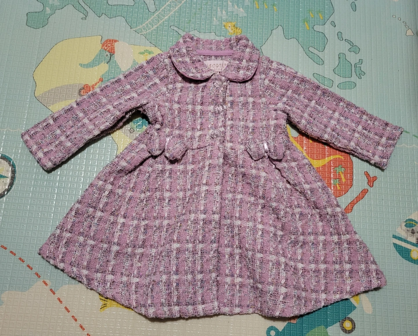 This is a lovely pink coat for a baby girl. It features a classic plaid pattern with subtle metallic threads woven throughout. The coat has a Peter Pan collar and decorative bows on the pockets. It's perfect for special occasions or everyday wear!