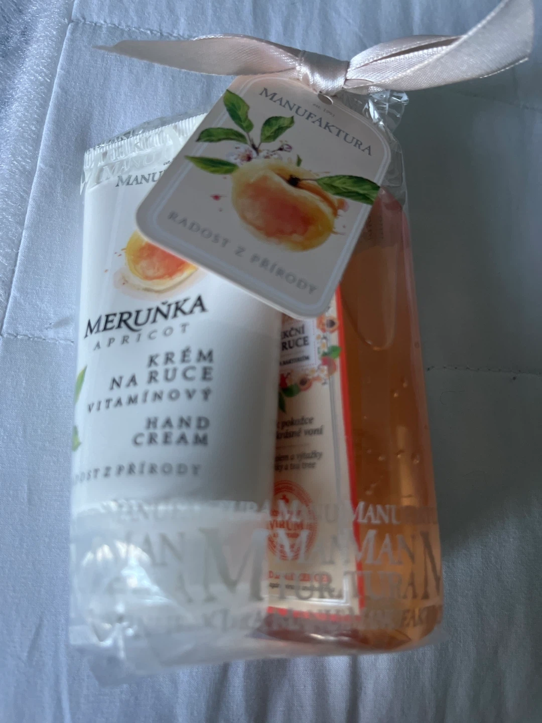 MANUFAKTURA Apricot moisturizing hand cream and revitalizing shower gel gift set. Both are apricot scented and come in a clear plastic bag with a ribbon and tag.