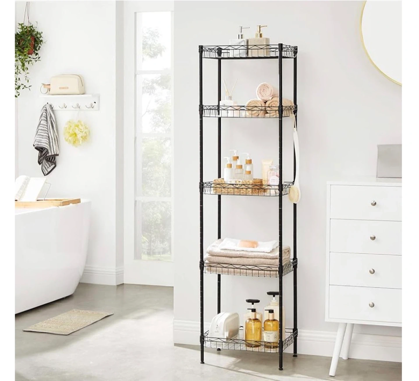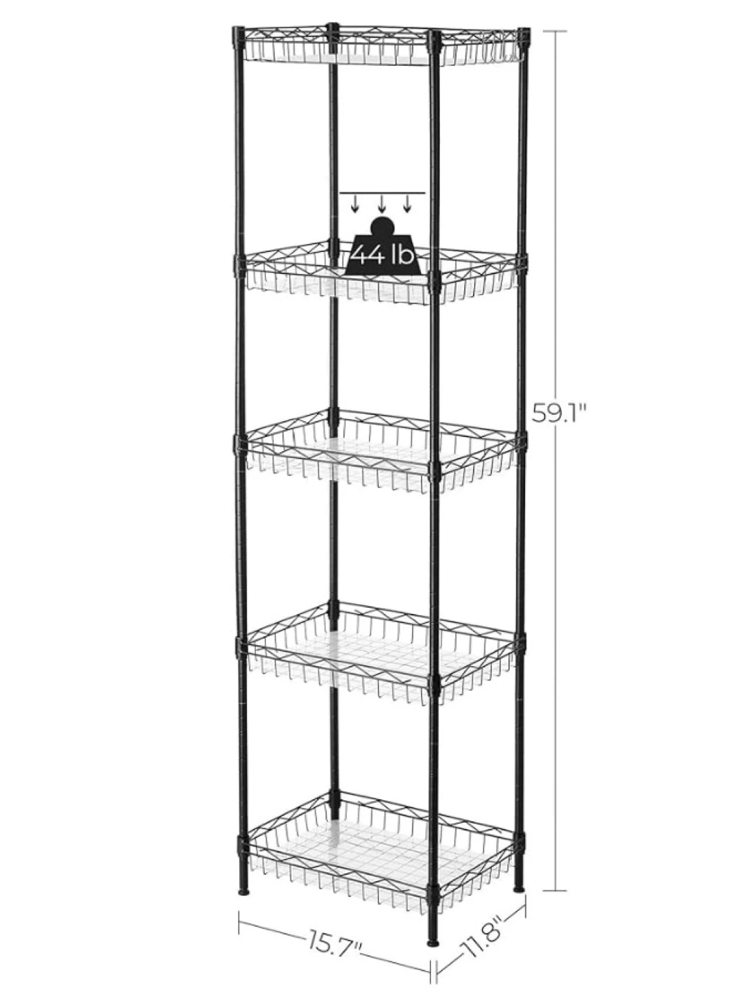 This 5-tier wire shelving unit is black and made of metal. It stands 59.1 inches tall with a depth of 11.8 inches and width of 15.7 inches. Each shelf holds up to 44 lb.