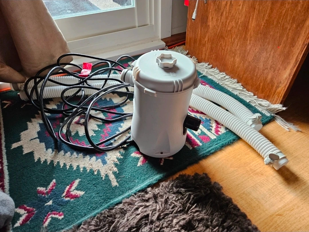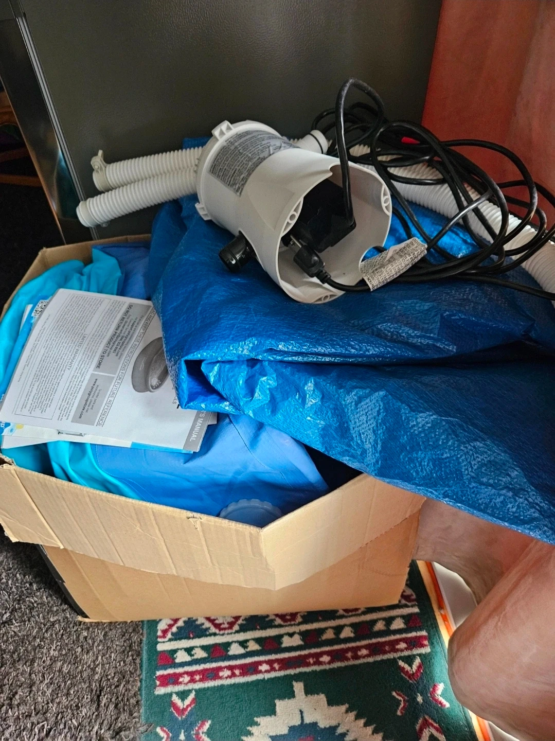 Comes with circle tarp, repair patch, filter pump, water cap, pipes, and instructions (as seen in photos). Everything that it came with when bought in box.