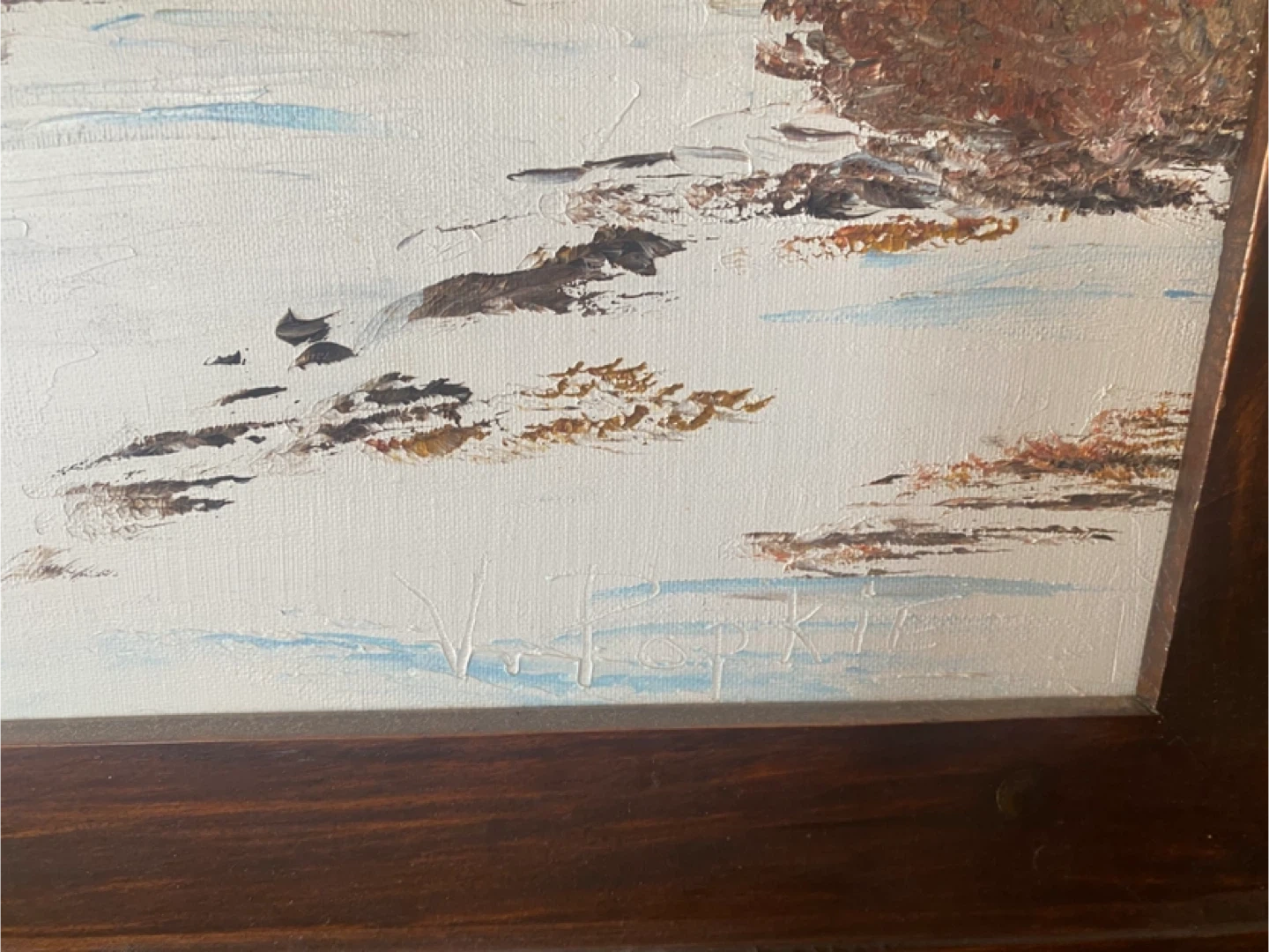 Oil painting by Vesta Popkie titled "Trapper's Camp Near Mattawa, Ontario". Created in February 1979. Features a rustic cabin in a snowy landscape.