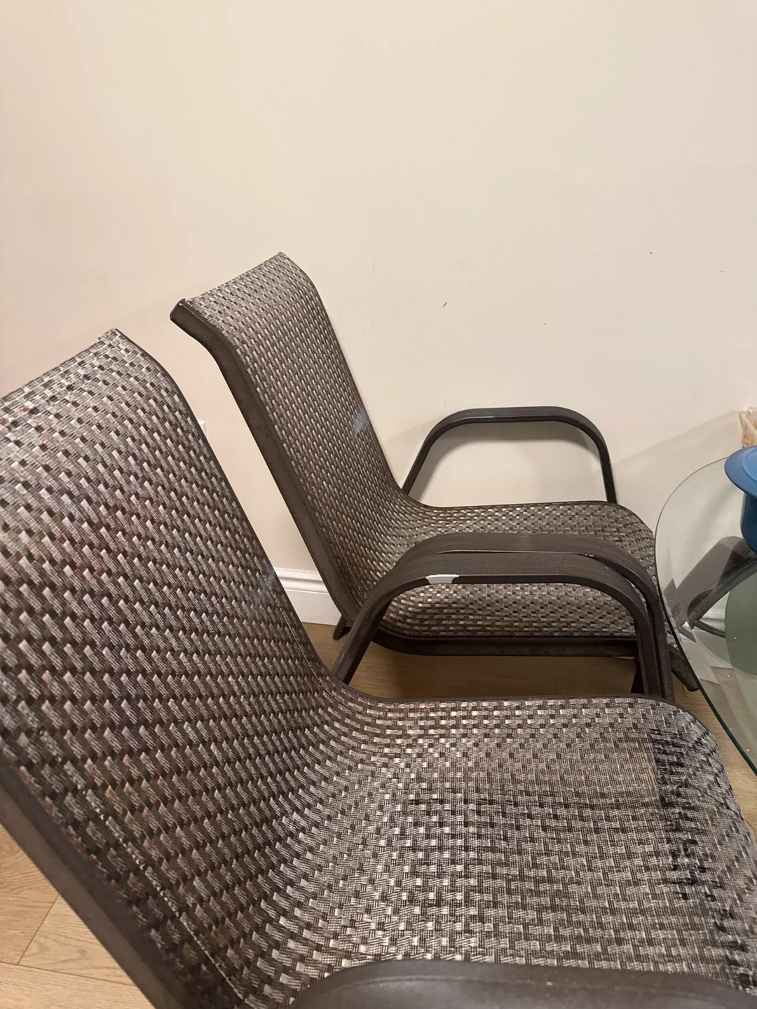 Selling a set of two woven patio chairs. These chairs are made with a durable metal frame and a woven material seat and back. They're dark brown and designed for outdoor use. Great for a backyard or balcony!