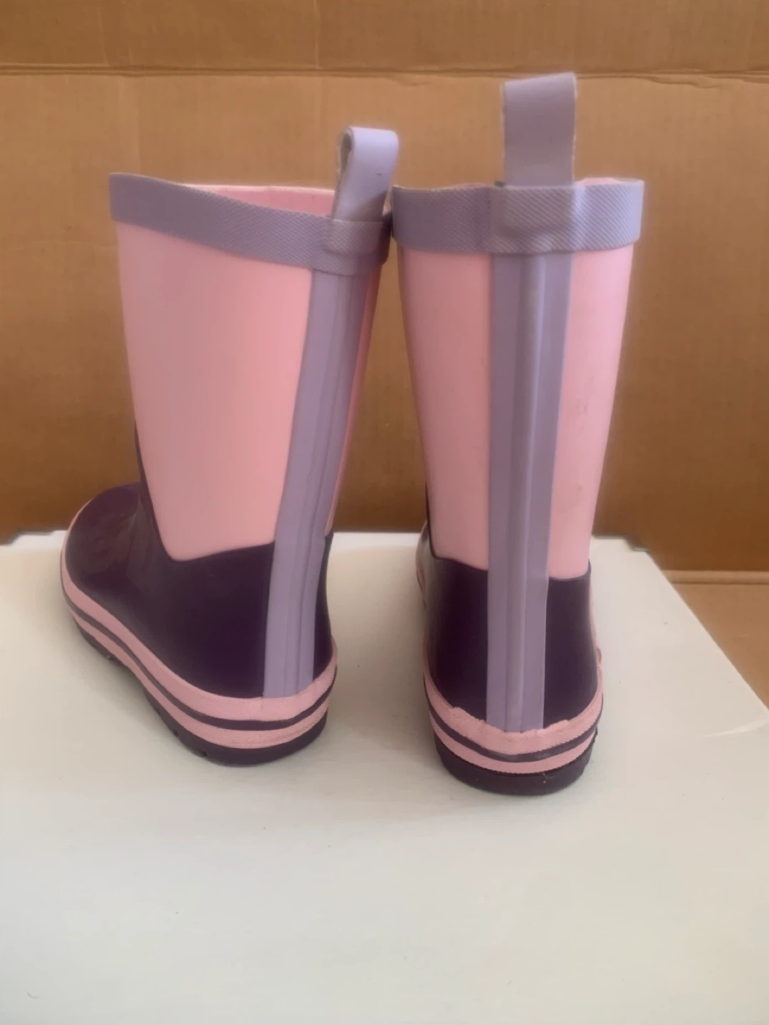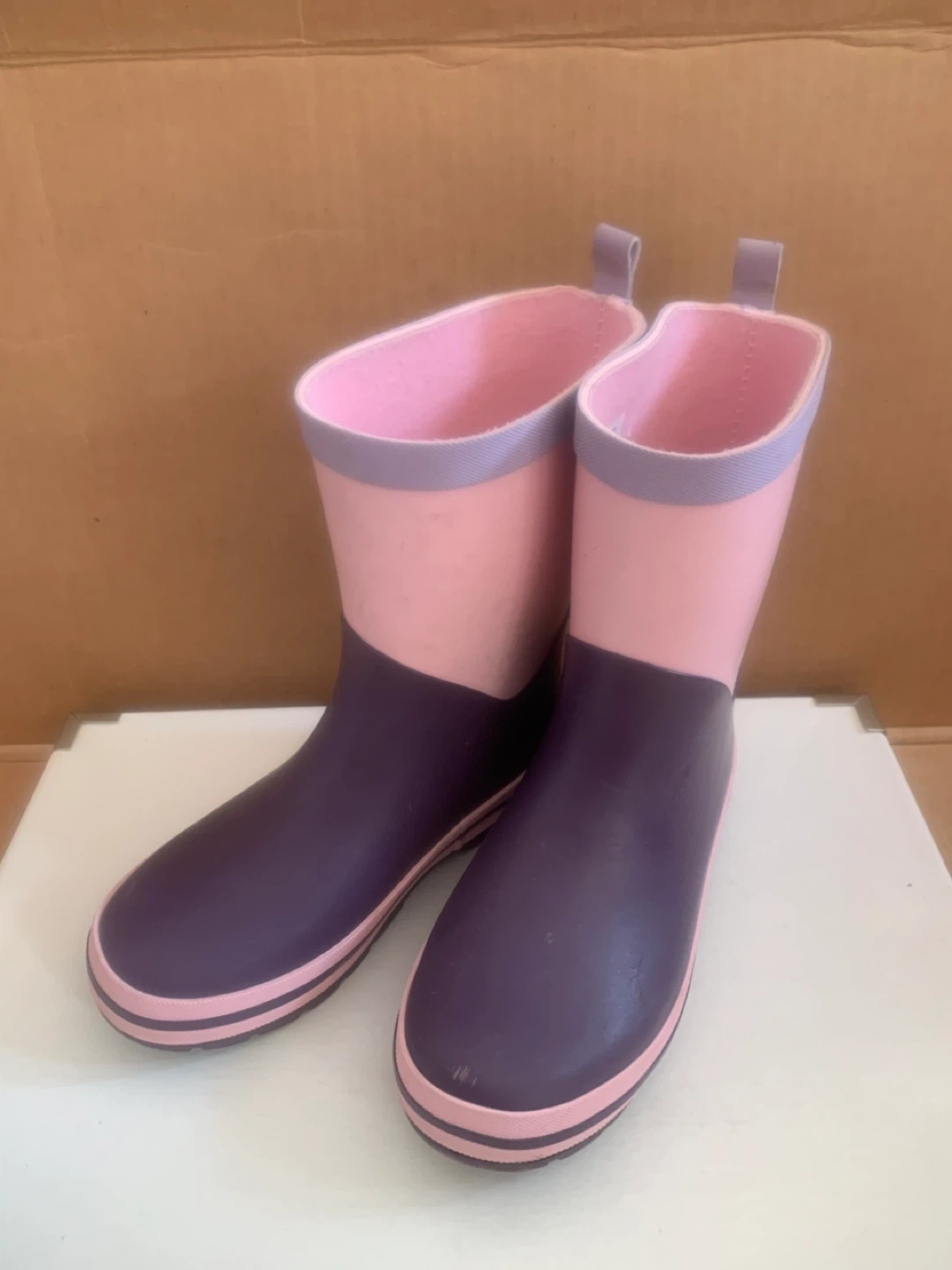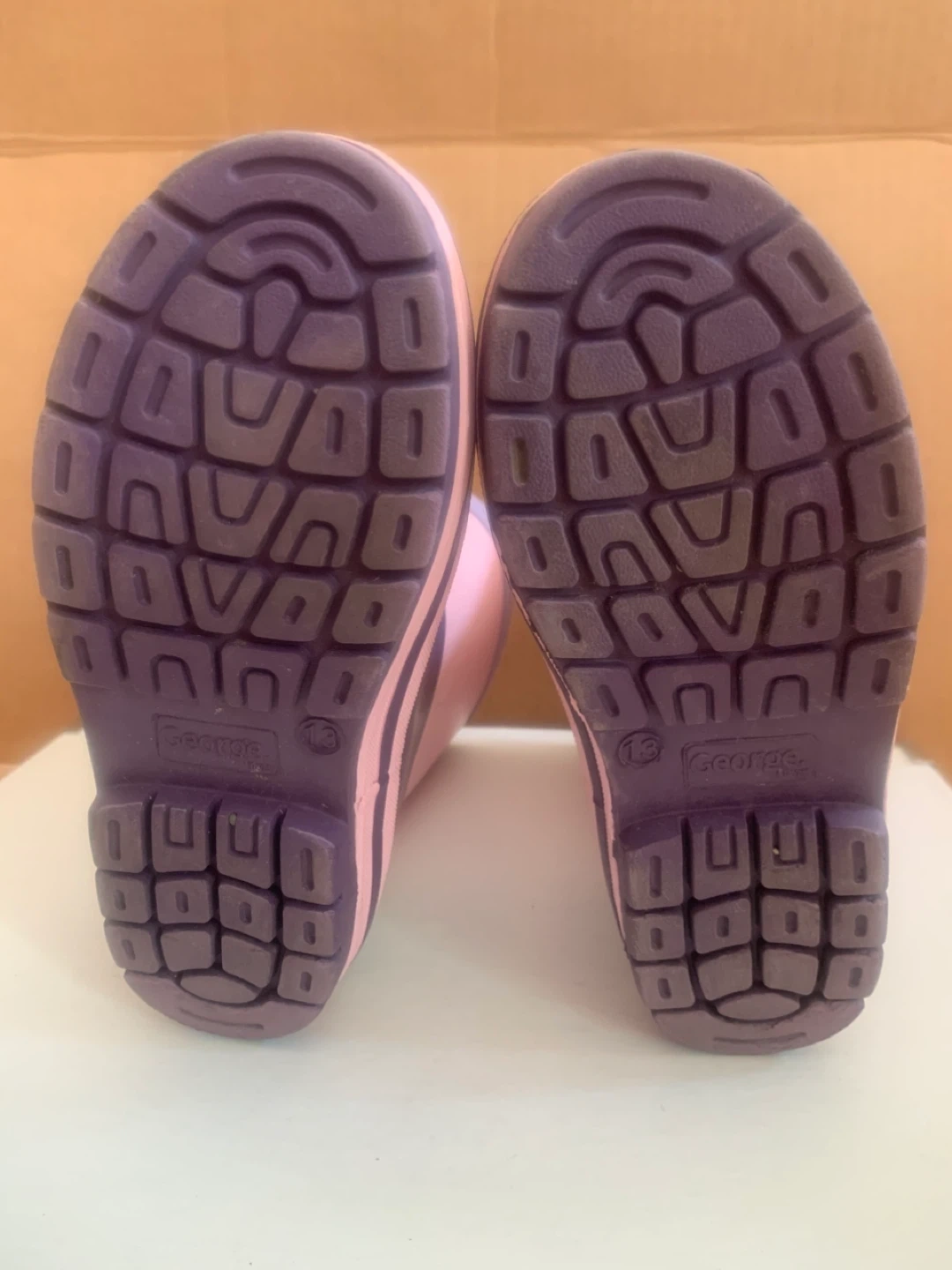 Waterproof rubber rain boots from George in size 13. These have a two-tone pink and purple design with a textured purple sole for grip. Back pull tabs are included for easy dressing.