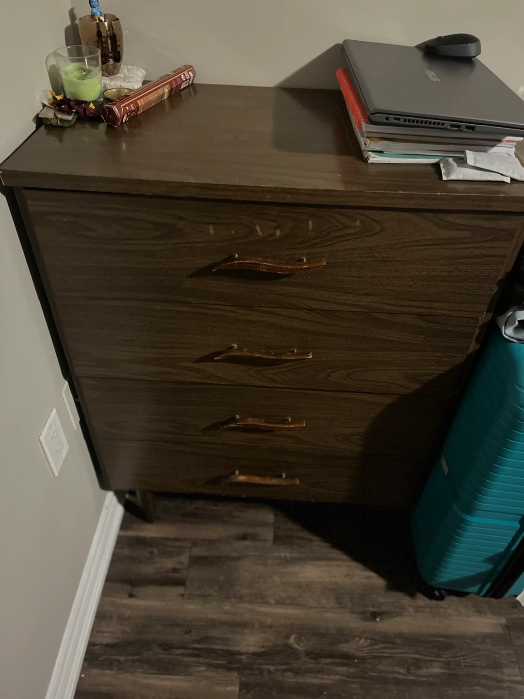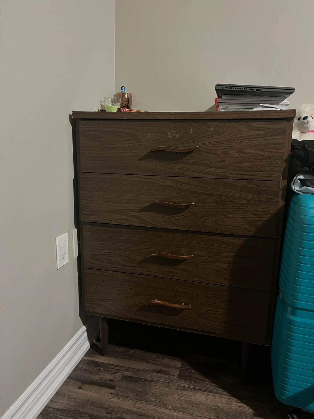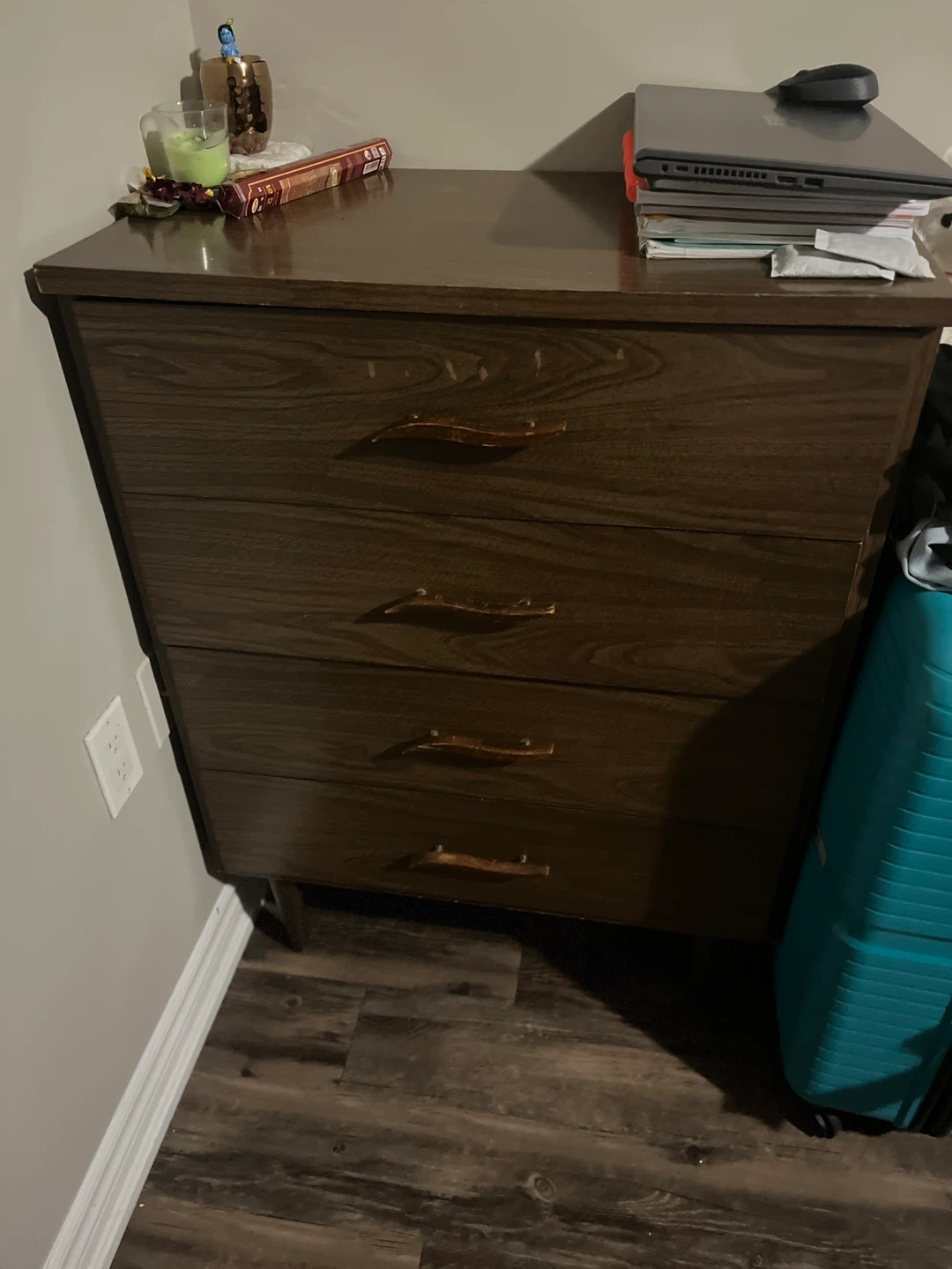 A vintage dresser with a dark wood grain finish. It has four drawers with unique wooden handles. This dresser offers ample storage space. It's a functional piece for any bedroom!