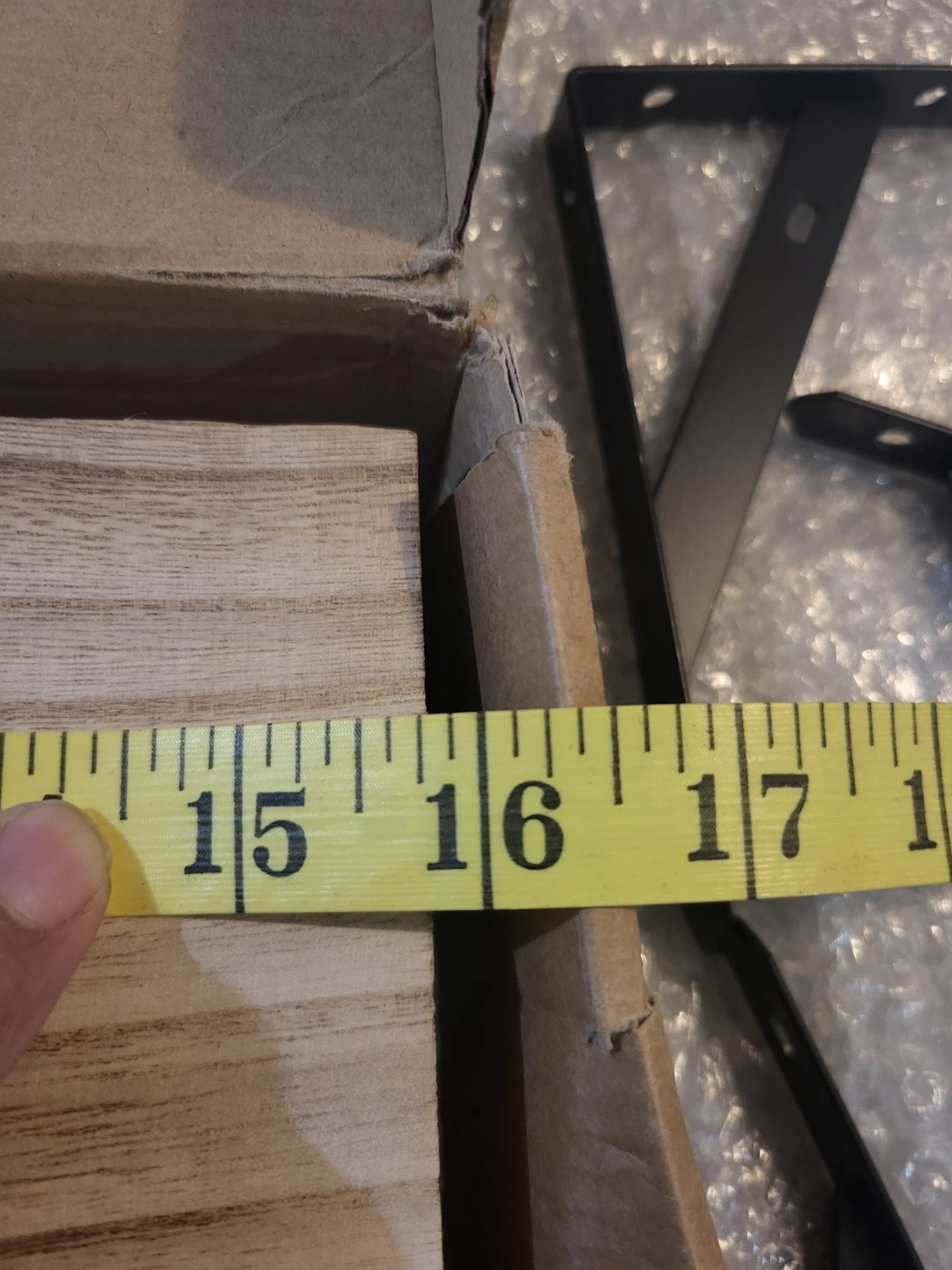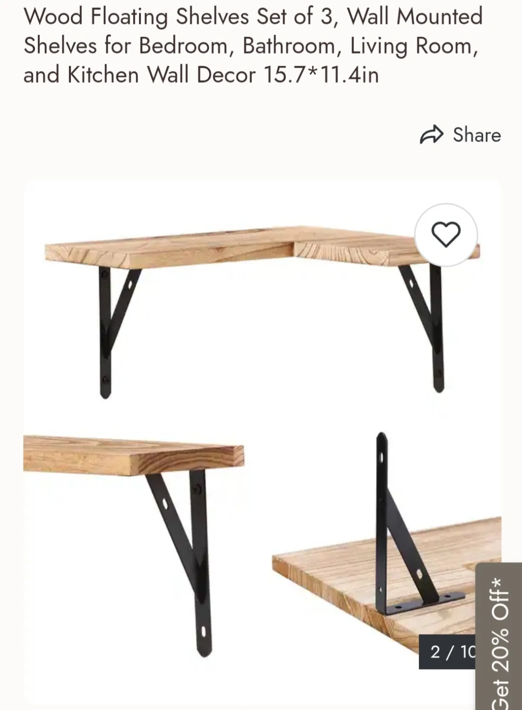 Set of 3 wood floating corner shelves with black metal brackets. Each shelf is approximately 15.7 inches long and 11.4 inches deep. Easy to install for any room's decor!