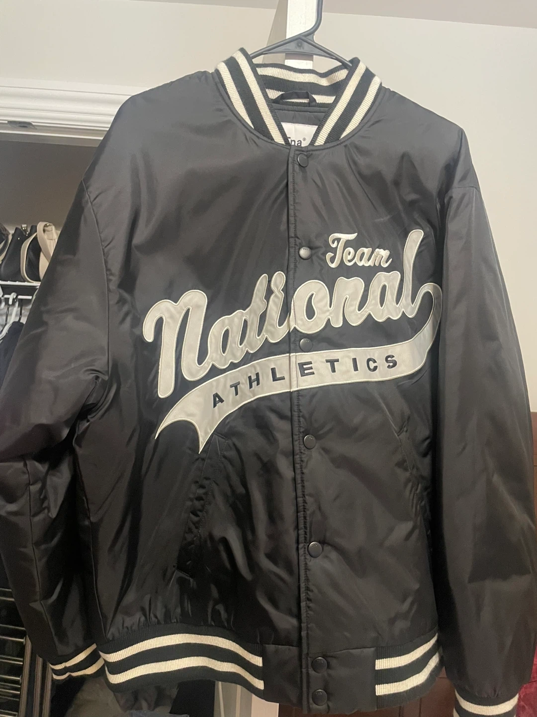 Black satin bomber jacket with 'Team National Athletics' embroidered on the front. Ribbed cuffs, collar, and hem. Snap button closure. This jacket's classic athletic design makes it a versatile layering piece.