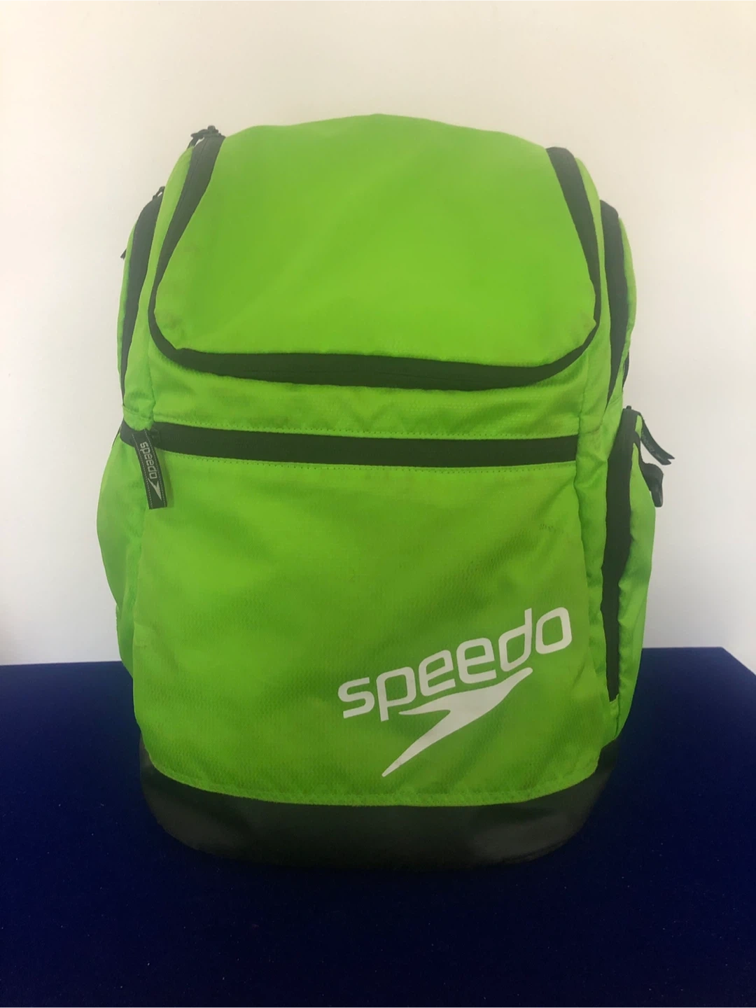 Bright green Speedo backpack with black accents. It has multiple zippered compartments. Perfect for carrying swimming gear or everyday essentials.