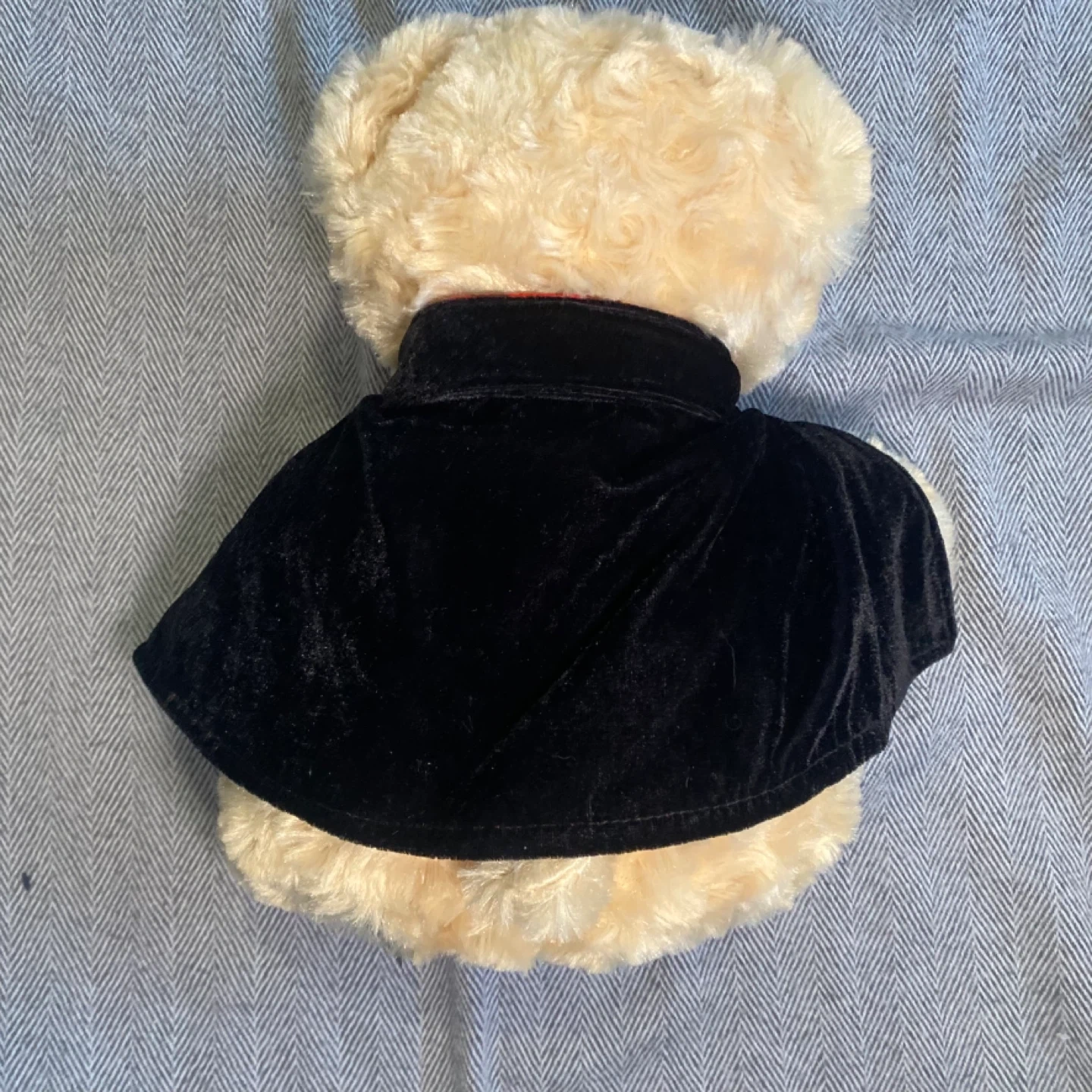 This is a cute teddy bear dressed as The Phantom of the Opera. It's wearing a tuxedo and a cape. A white mask is also on its face. The left paw has "The Phantom of the Opera" embroidered on it. It's a great collectible for fans! (Rare find)