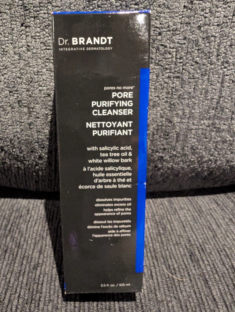 Selling a Dr. Brandt Pores No More Pore Purifying Cleanser. It contains salicylic acid, tea tree oil, and white willow bark to help purify your skin. It dissolves impurities, eliminates excess oil, and helps refine the appearance of pores. The bottle contains 3.5 fl oz / 105 ml
