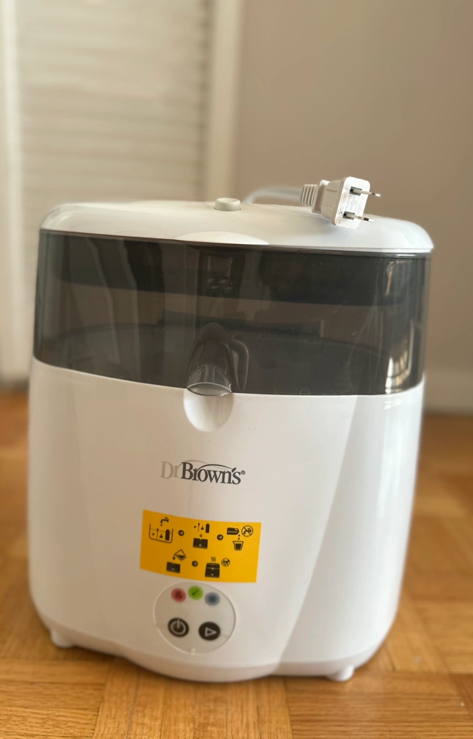 176Electric baby bottle sterilizer. White plastic. Includes power cord. Simple controls.