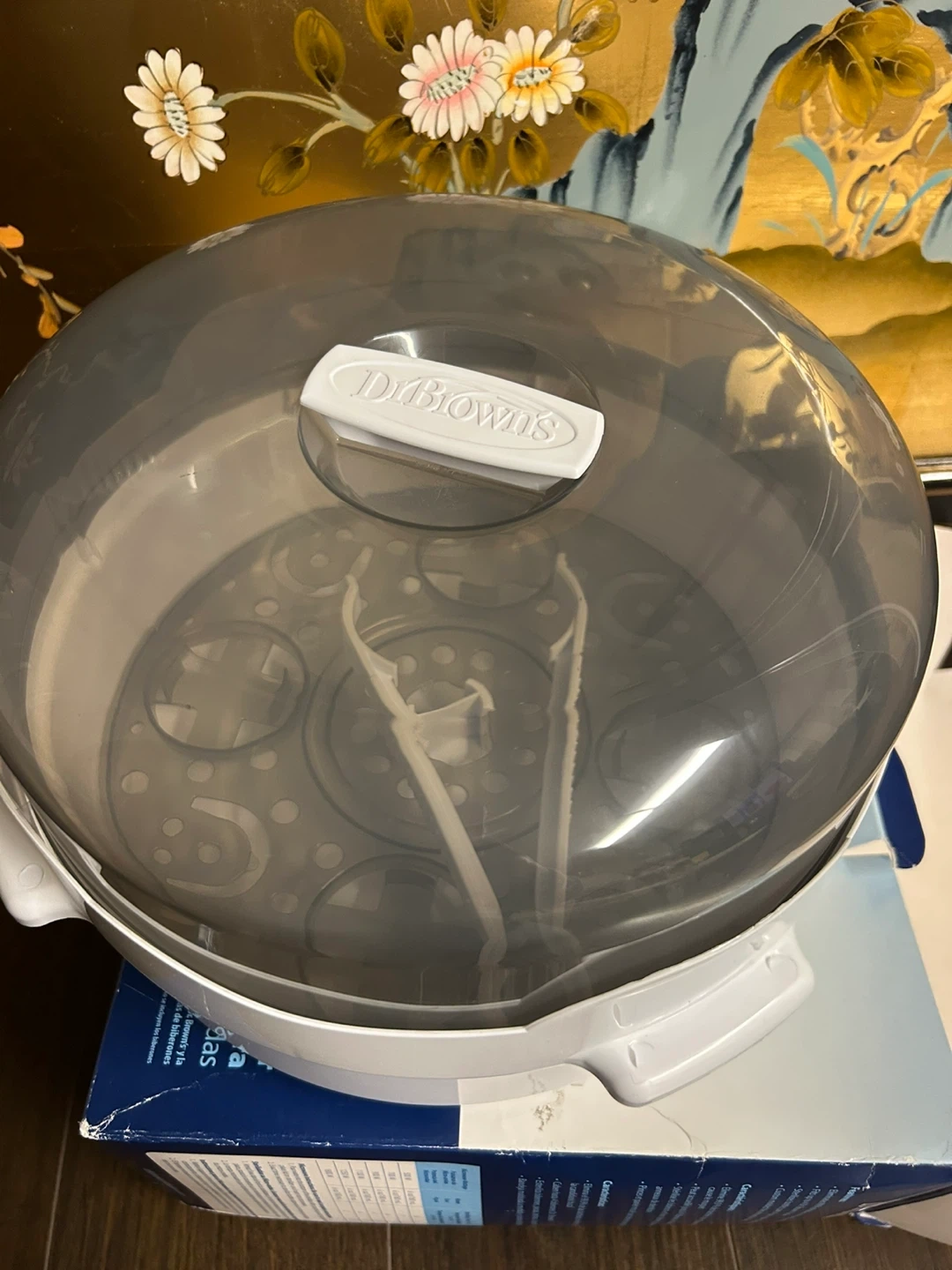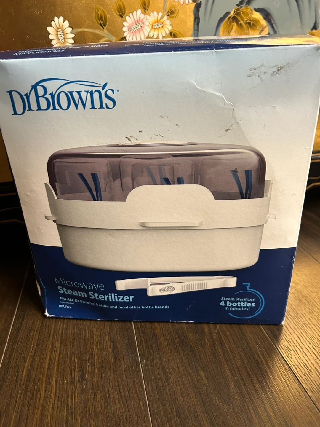 Selling a Dr. Brown's Microwave Steam Sterilizer! It's perfect for sterilizing baby bottles quickly and easily. This sterilizer fits all Dr. Brown's bottles and most other bottle brands. It can sterilize up to 4 bottles in just 4 minutes. Comes with the original box! New opened box . Box has some damage but the product has not been used. Assembled to show product . Price is firm