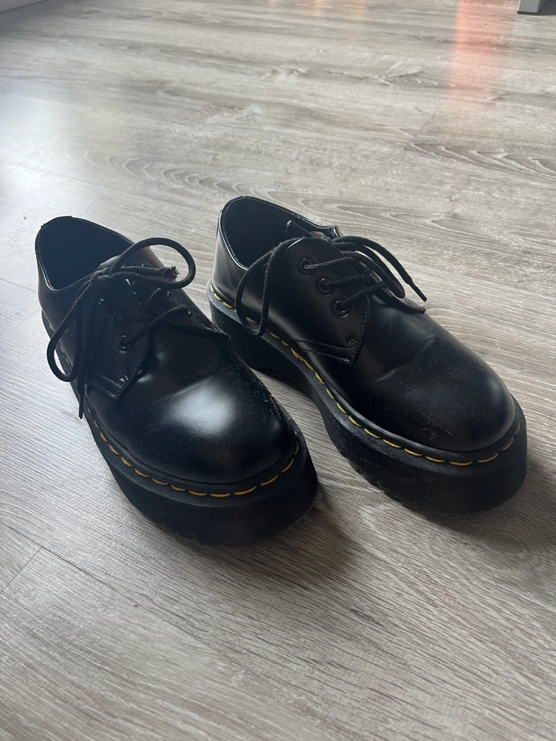Selling a pair of Dr. Martens 8053 Quad platform shoes. They are black and have a thick platform sole. These shoes are super stylish and in great condition!