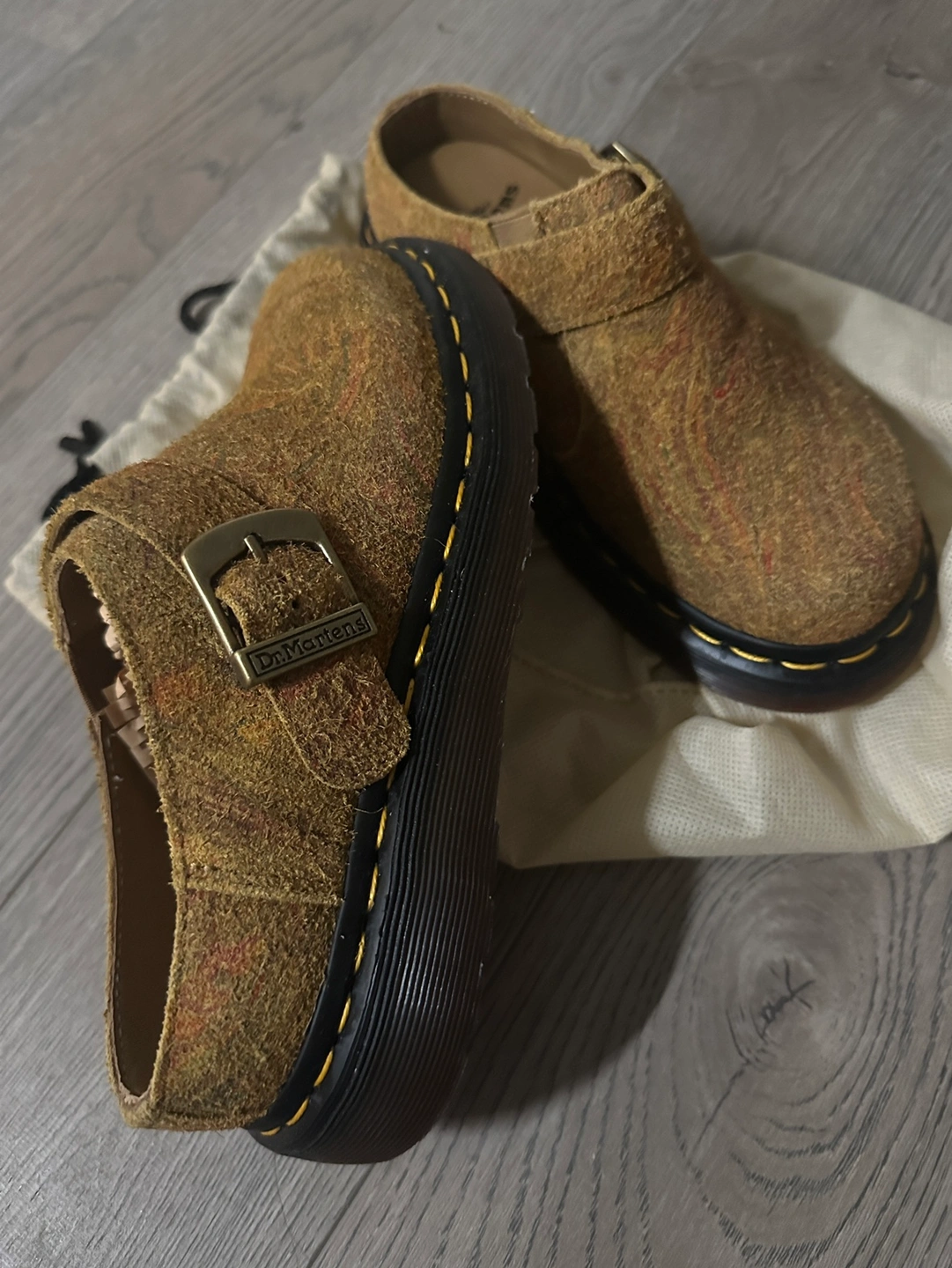 26These are a pair of Dr Martens Clogs in a suede brown colour with a floral design. Marbled Suede is soft and supple with a marbled print effect Construction - Made with our Goodyear-welted lines are heat-sealed at 700˚C and reinforced with our signature welt stitch Sole Height - Platform height: 1 in Heel height: 1 1/2 in Footbed - Slimmer and a more tapered toe shape
