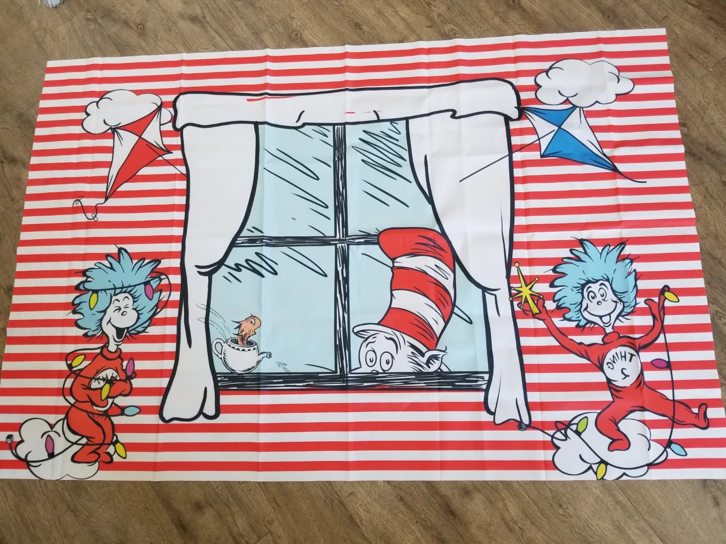 240Red and white striped fabric backdrop. Features Cat in the Hat, Thing 1, Thing 2, and a fish in a teapot. Perfect for a birthday party or themed event. Approximately 58x32